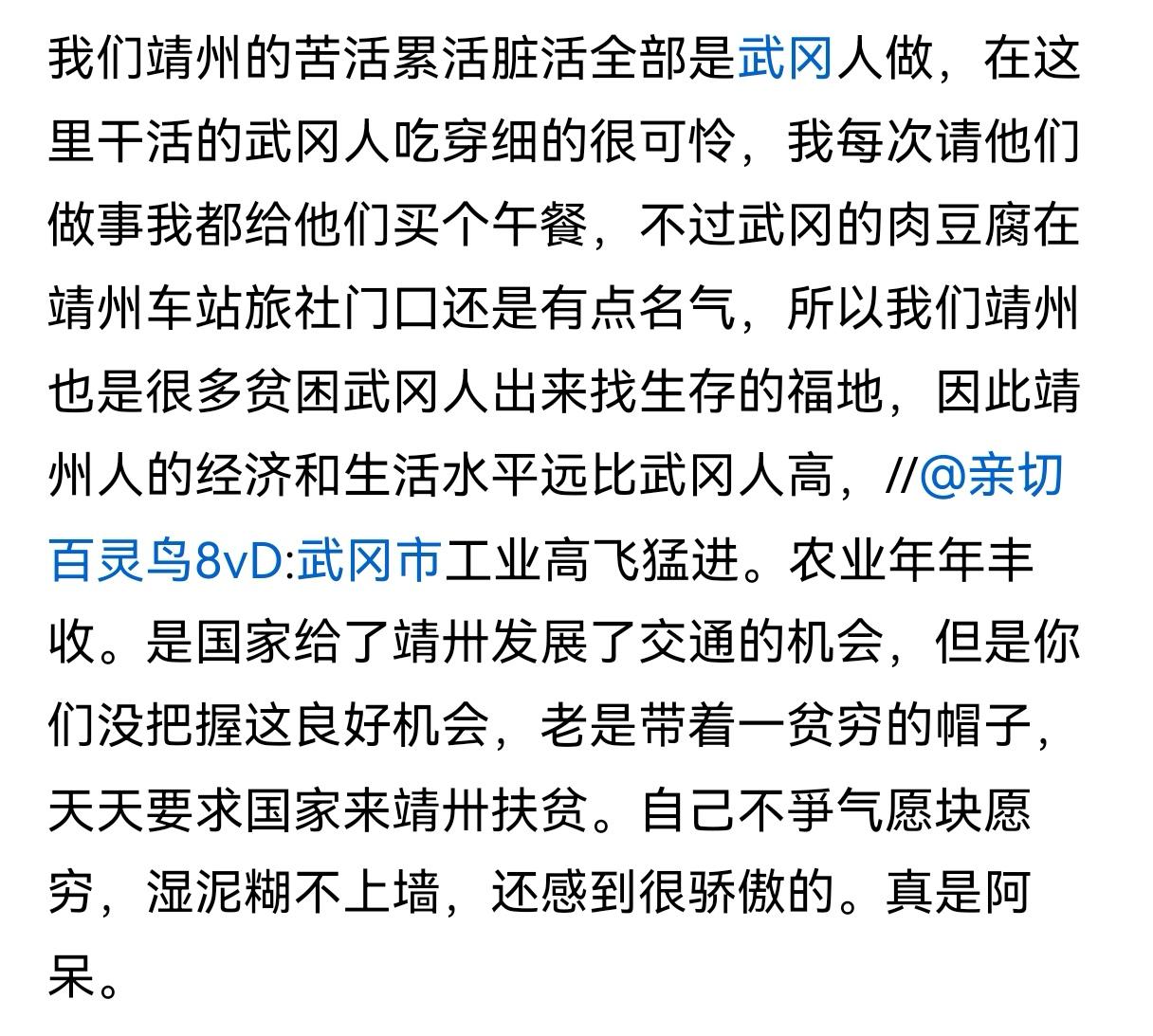 笑话:靖州比武冈好 说武冈人能吃苦,这是真的!武冈周围县的脏活累活,很多也是武冈人干,但城步、新宁、绥宁、洞口的经济都比不上武冈。能吃苦是好传统,好吃懒做才应该被谴责。靖州的苦活累活是武冈人做,不代表靖州的生活水平比武冈高。