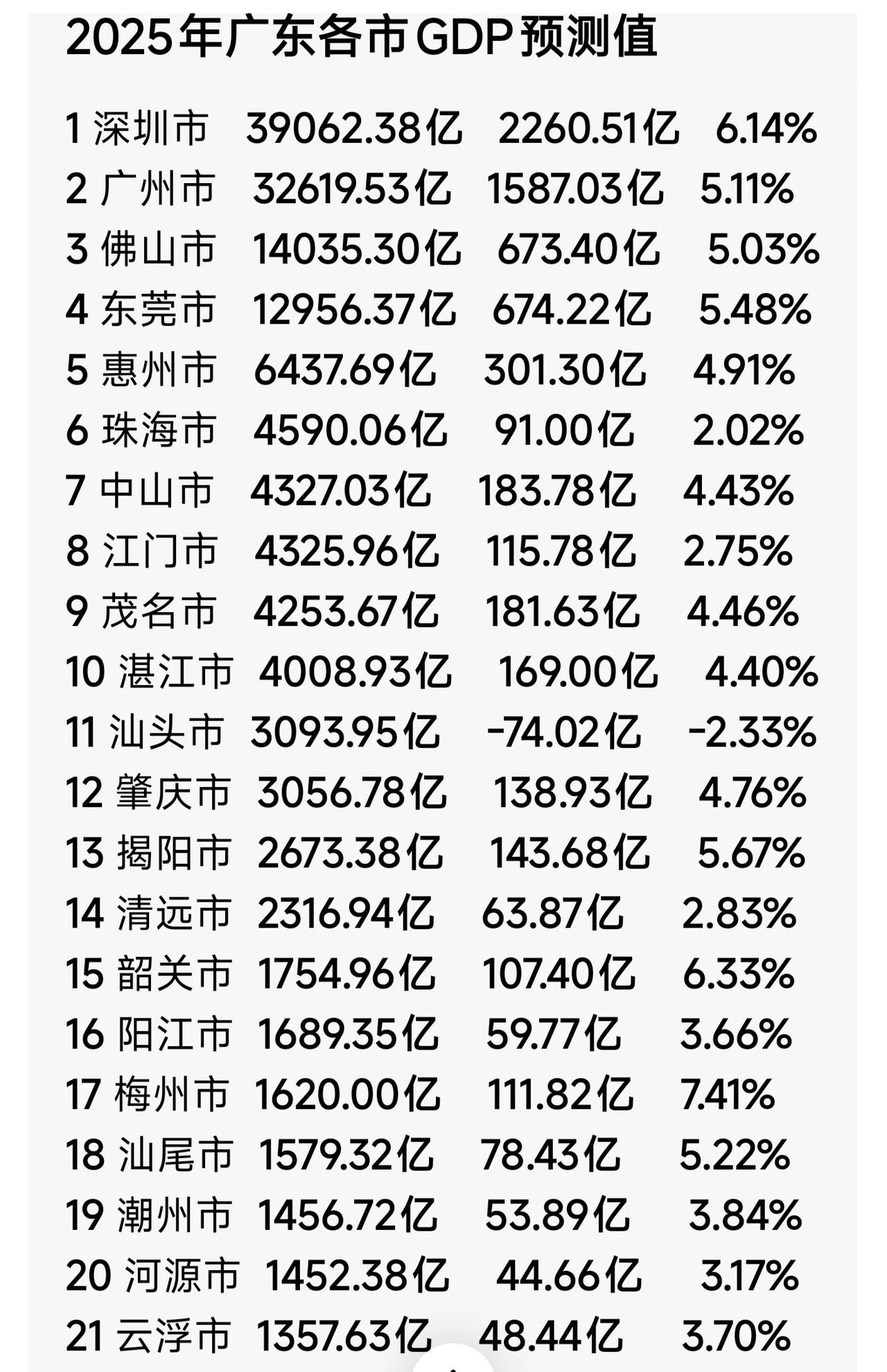 2025年广东各城市GDP最新预测值,具体数据以官方公布为准。根据预测全省除了汕头外GDP都实现了正增长,深圳突破3.9万亿,肇庆突破3000亿大关。而且肇庆GDP已与汕头比较接近,或许会在2026年超越汕头。总的来说2025年广东经济增长不及江苏,江苏与广东的GDP差距进一步缩小了。