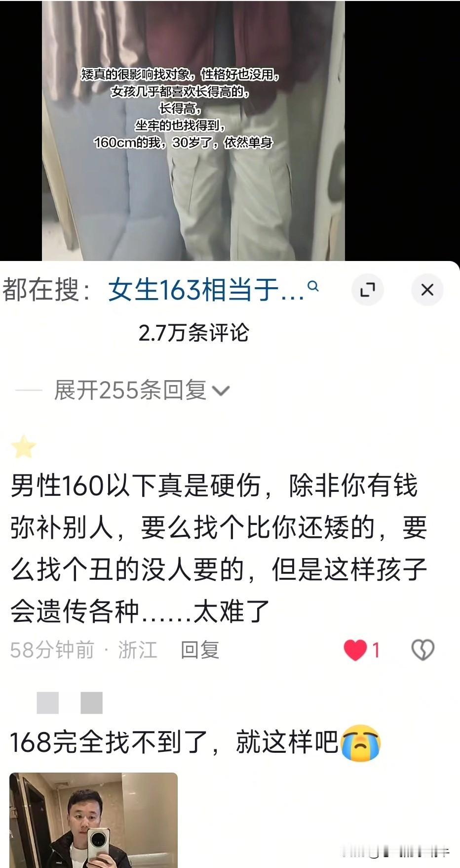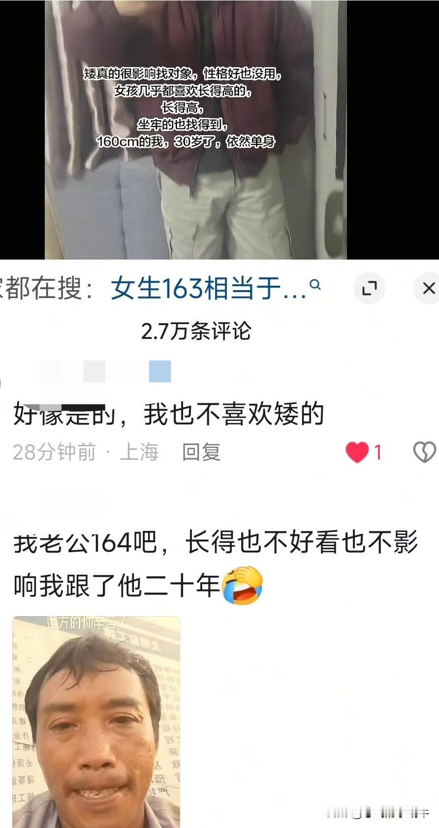 你嫌弃别人150的时候,别人更嫌弃你160[呲牙]谁也别说谁! 没办法,女的如果自己都矮,那她再找个矮的,以后的孩子咋办? 找对象结婚又不是谈恋爱,随便找个就行了!那肯定得找个差不多的呀! 男的吧,最起码得个高一点,不丑,性格好一点吧,这样那对象挺好找! 以前碰到一个男的,身高158,脸上是挺好看的,他是使劲追一个女孩子,还请教我怎么追女孩,其实我也不懂怎么追啊,但是我喜欢百度啊,哈哈,帮他在百度上找答案,他追了人家一个月,那女孩子还是决定回老家去了,他还哭的要死,我们都笑他,没办法,你矮,要么有才华,要么有钱要么有能力,你矮啥也没有只会进厂打螺丝,那女孩子你再给人花钱,人家也不会接受你啊!这就是现实[憨笑][呲牙][呲牙][呲牙][呲牙]