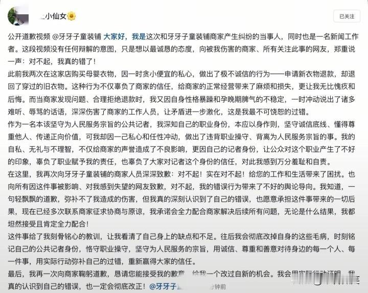 人如其名!山东滨州的“坡上小仙女”王女士,在童装店买了衣服后,却退货旧的衣服,平台6次拒退,最后因为超时了,系统自动退款了。 退货期间,“坡上小仙女”一直辱骂商家,“真的关门吧!死了好投胎”等恶劣言语! 据悉,“坡上小仙女”是惠民县融媒体中心的一名记者,目前,“坡上小仙女”王女士已与单位解除劳动合同! 事情发酵后,“坡上小仙女”顶不住舆论压力,发布道歉视频,称自己是因为性格暴躁,孕期期间性格不稳定才做出了不理智的行为! 但道完歉后,“坡上小仙女”后台又辱骂商家!咒商家“你家孩子下地狱”! 真是人如其名!“小仙女”就是“小仙女”,人品差,素质低! 退款女孩