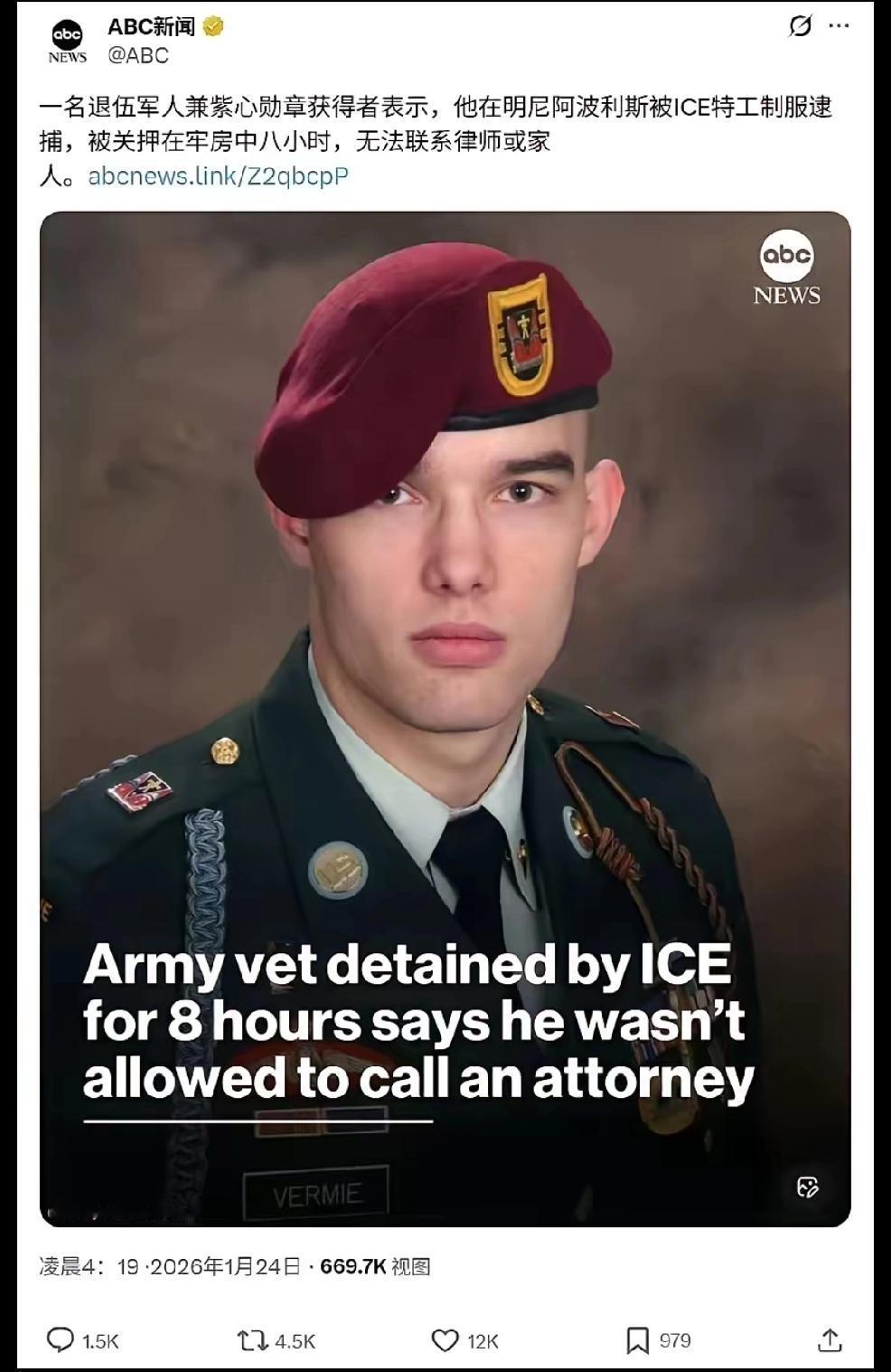 据外媒报道,1月13日,美国,一位39岁的退伍军人紫心勋章获得者-弗米被ice抓走了。事件经过:1月13日,弗米在人行横道围观IGE抓捕两名青年,称被特工推搡后,拒绝退让,遭4~5名特工按倒,手铐制服,现场有视频。被关押到联邦大楼,约八个小时,期间多次请求打电话被拒,无法联系律师或家人;妻子已聘请律师,但律师始终无法对接。弗米宣称被宣读权利后,拒绝无律师问询,特工仅称:“稍后有机会联系”。 个人认为:什么美国特工抓捕一个“为美国立功受勋的原籍美国人”? 难道美国人执法?就可以胡作非为吗? 难道美国人这样执法就不怕美国民意极端化吗? 莫非特朗普等极少数人,假借驱除非法移民的时机,镇压“对手”。