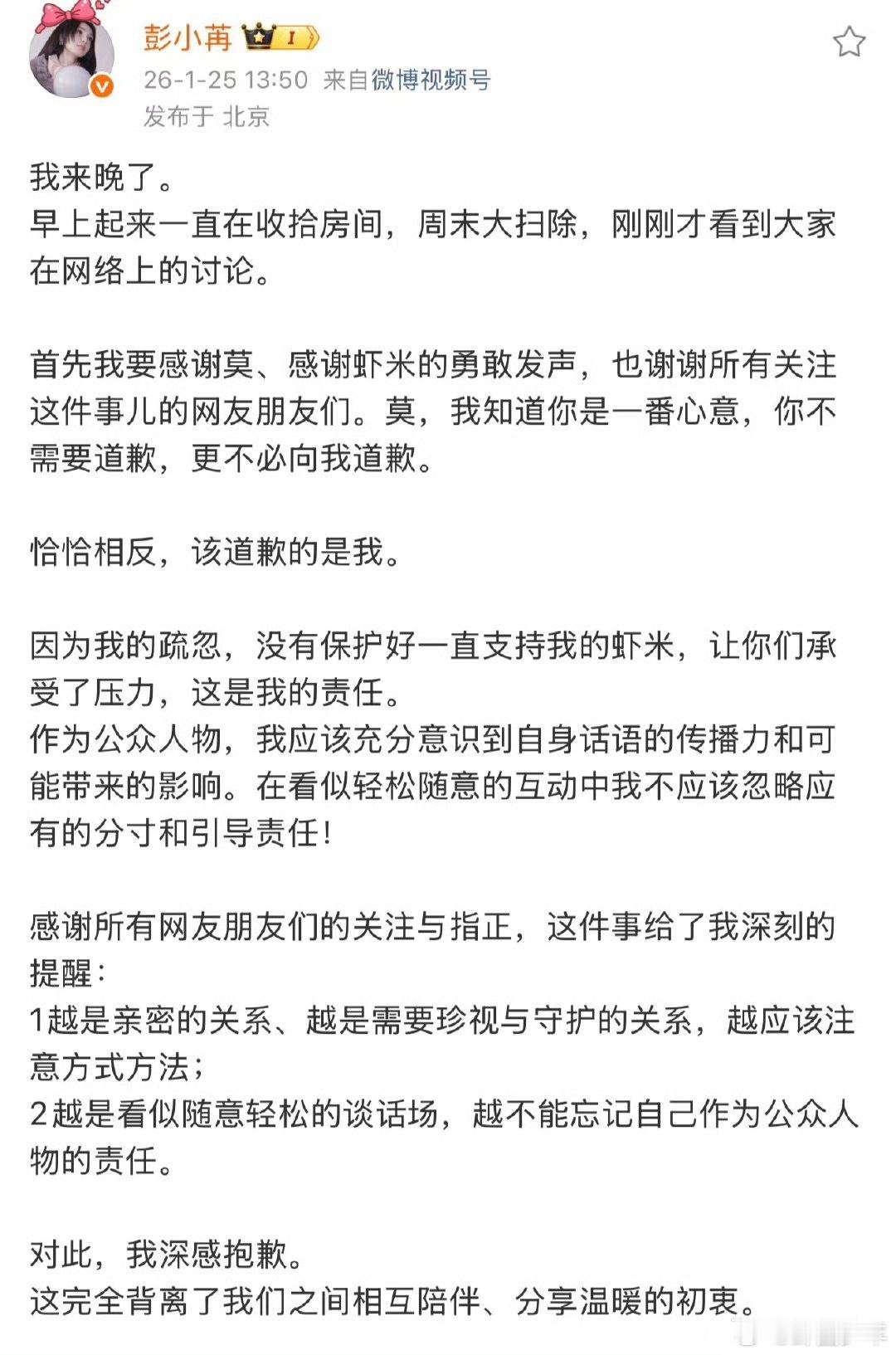彭小苒发长文道歉 彭小苒因回复粉丝“祝你天天加班”引发舆论热议,事件发酵后其本人发布长文致歉,关于其是否该道歉的话题也引发网友不同看法。