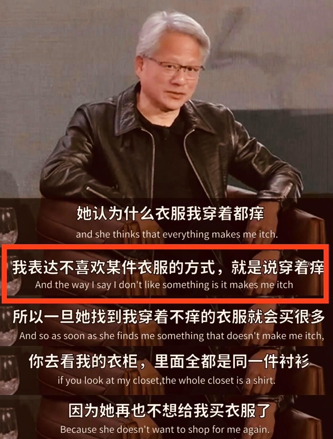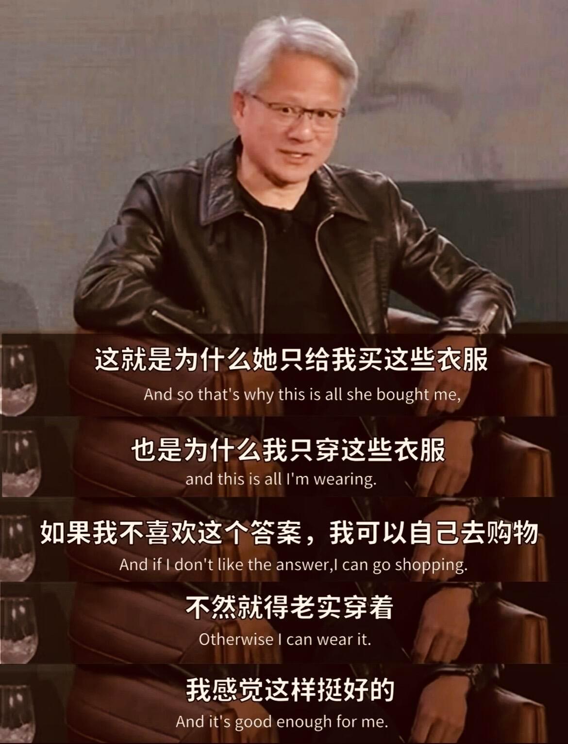 原来黄仁勋经典的皮夹克+黑色T恤穿搭,都是他老婆为了“敷衍”他一直挑剔说别的衣服“穿着痒”,批量采购的