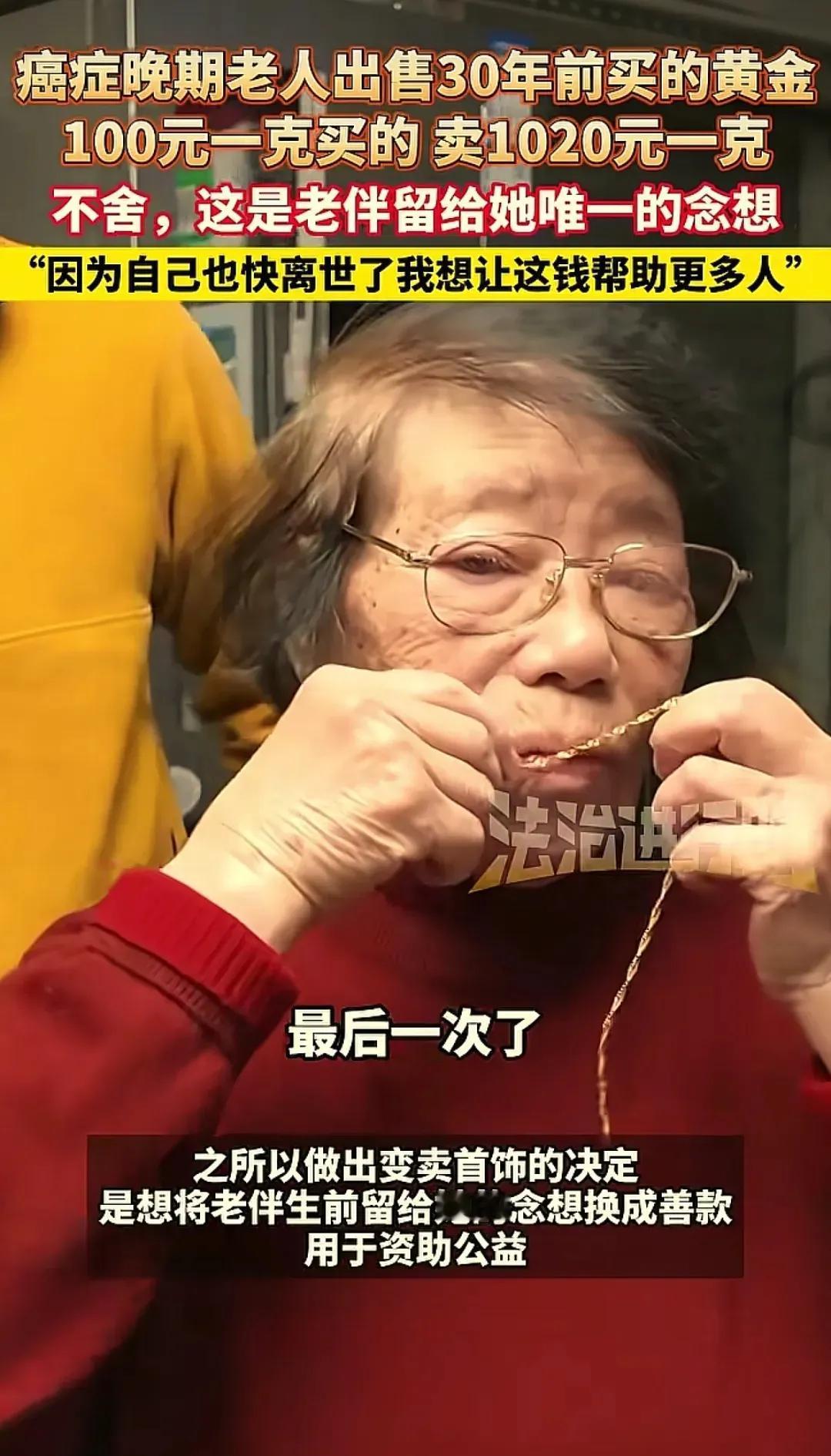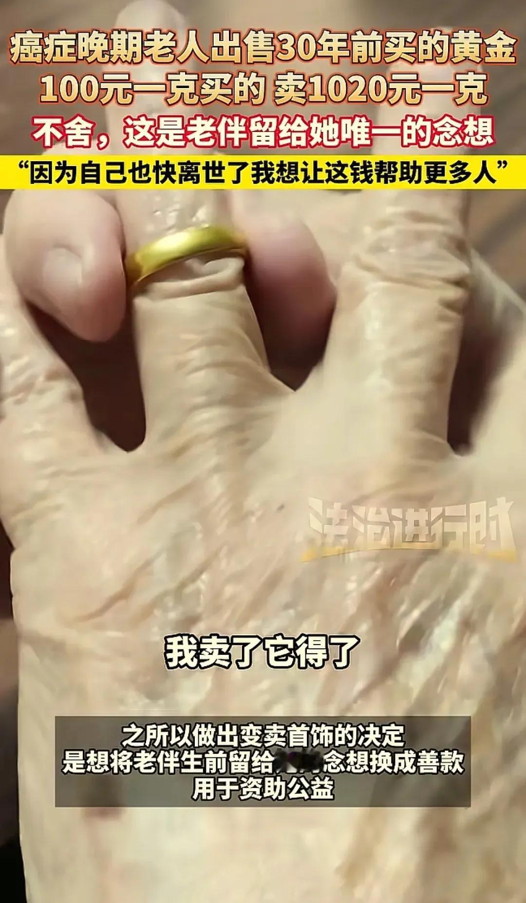 泪目了!北京87岁的王奶奶,在结肠癌晚期的日子里,做出了一个让所有人泪目的决定——卖掉老伴30年前送她的黄金首饰,把近10万元全部捐给癌症康复中心。 镜头里,她枯瘦的手指捏着戒指,轻轻贴在唇边吻了一下。这个动作比任何豪言壮语都动人,那是她和老伴跨越三十年的告别,也是一场关于爱的接力。上世纪90年代,100元一克的黄金是老两口省吃俭用攒下的家底,是老伴攥着她的手说“以后有这个,就有底气”的承诺。这枚戒指、这条金链,锁着他们一辈子的烟火气,是老伴走后留给她的唯一念想。 如今金价翻了十倍,1020元一克的回收价,让这些首饰变成了沉甸甸的现金。王奶奶却一分没留,全部捐给了和她一样在病痛里挣扎的人。她轻描淡写地说:“留着没心思戴,不如做有意义的事。” 轻描淡写的一句话,藏着最厚重的温柔。 我们总在说黄金保值,可在王奶奶这里,黄金的价值早就超越了克重和价格。三十年前,这是老伴给她的安全感;三十年后,她把这份安全感掰碎了,分给了更多攥着诊断书流泪的陌生人。金店老板说首饰纯度差了一点点,可这份心意的纯度,足有九个九。 比起那些把黄金锁在保险柜里的人,王奶奶才真正让黄金“活”了过来。她没读过什么大道理,不懂“利他主义”的定义,只知道“自己淋过雨,就想给别人撑把伞”。在满屏都是“搞钱”的当下,她用最朴素的方式告诉我们,真正的财富从来不是手里攥着多少金子,而是心里装着多少别人。 那个吻别的动作,是世间最好的爱情注脚。不是轰轰烈烈的誓言,是把对方的爱揣在心里,在生命的最后一程,让这份爱延续成更多人的希望。王奶奶的选择,让我们看到了普通人身上最耀眼的光芒。 当我们还在纠结生活里的得失时,这位老人已经用行动给出了答案:爱不是锁在抽屉里的念想,是能传递给别人的温暖。
