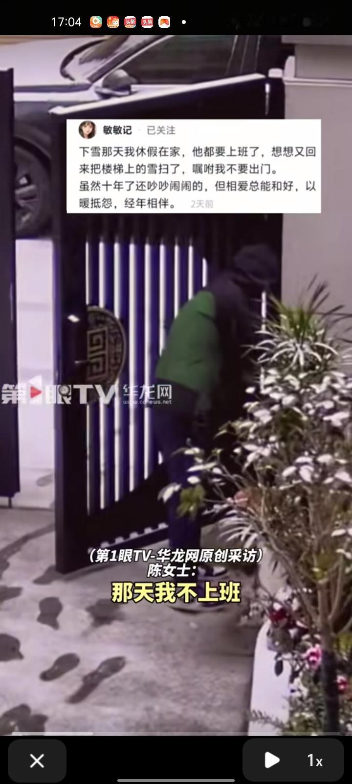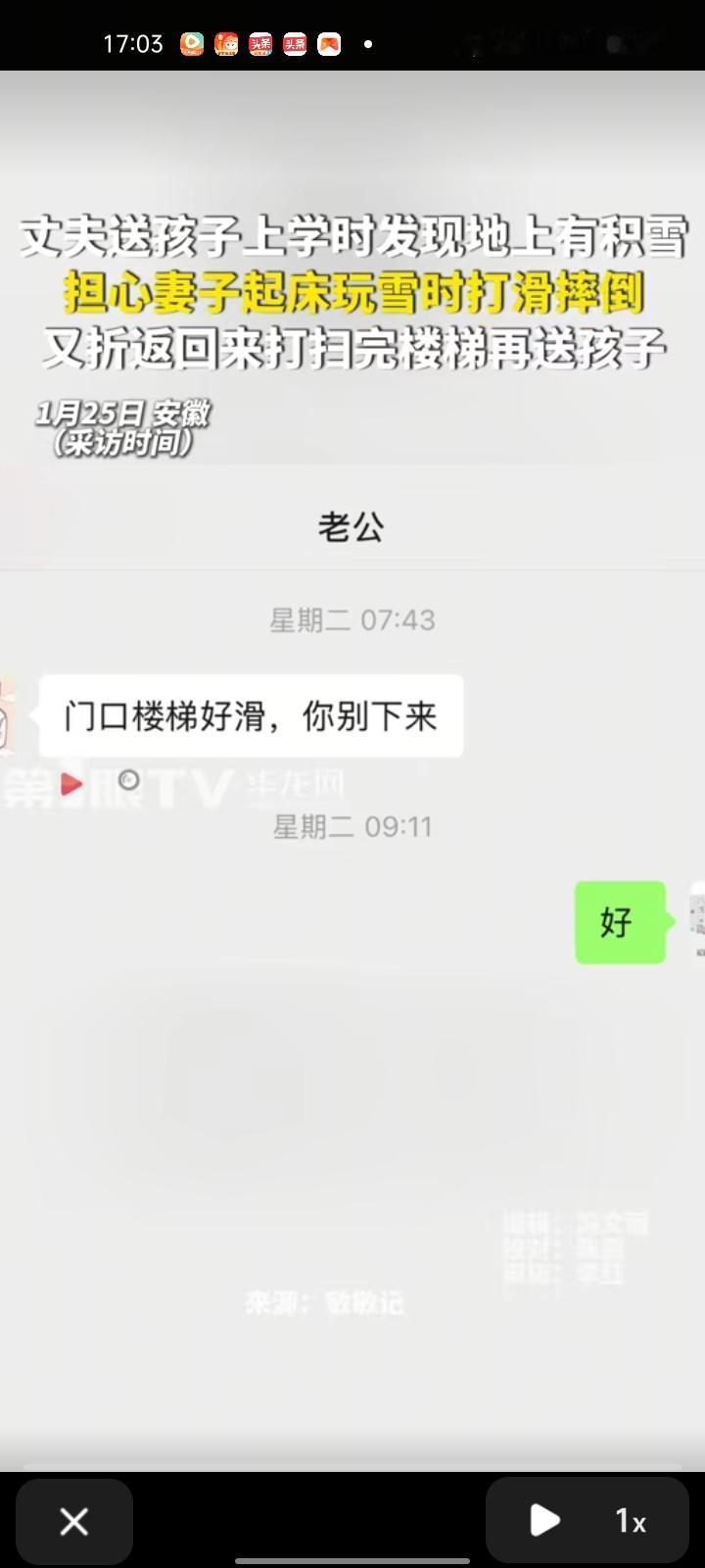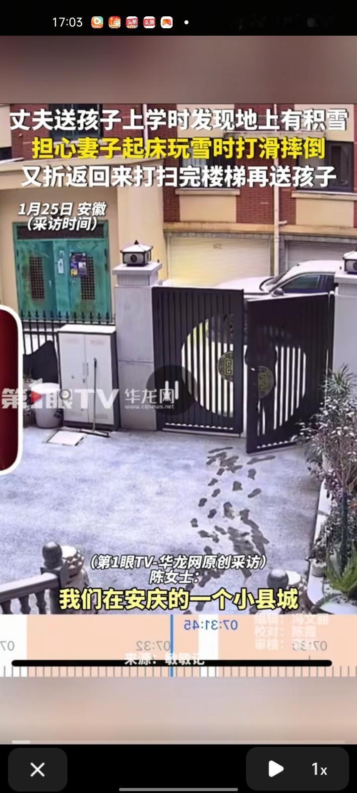 1月25日,安庆市望江县。丈夫送孩子上学时发现楼梯上有积雪,担心妻子起床玩雪时打滑摔倒,就把楼梯上的雪扫了。等妻子醒来后,看到他发消息说“别下来”,在床上翻监控看到这一幕。 妻子陈女士表示,我们在一起十年了,也在同一单位,几乎天天见面,他一直很照顾我。