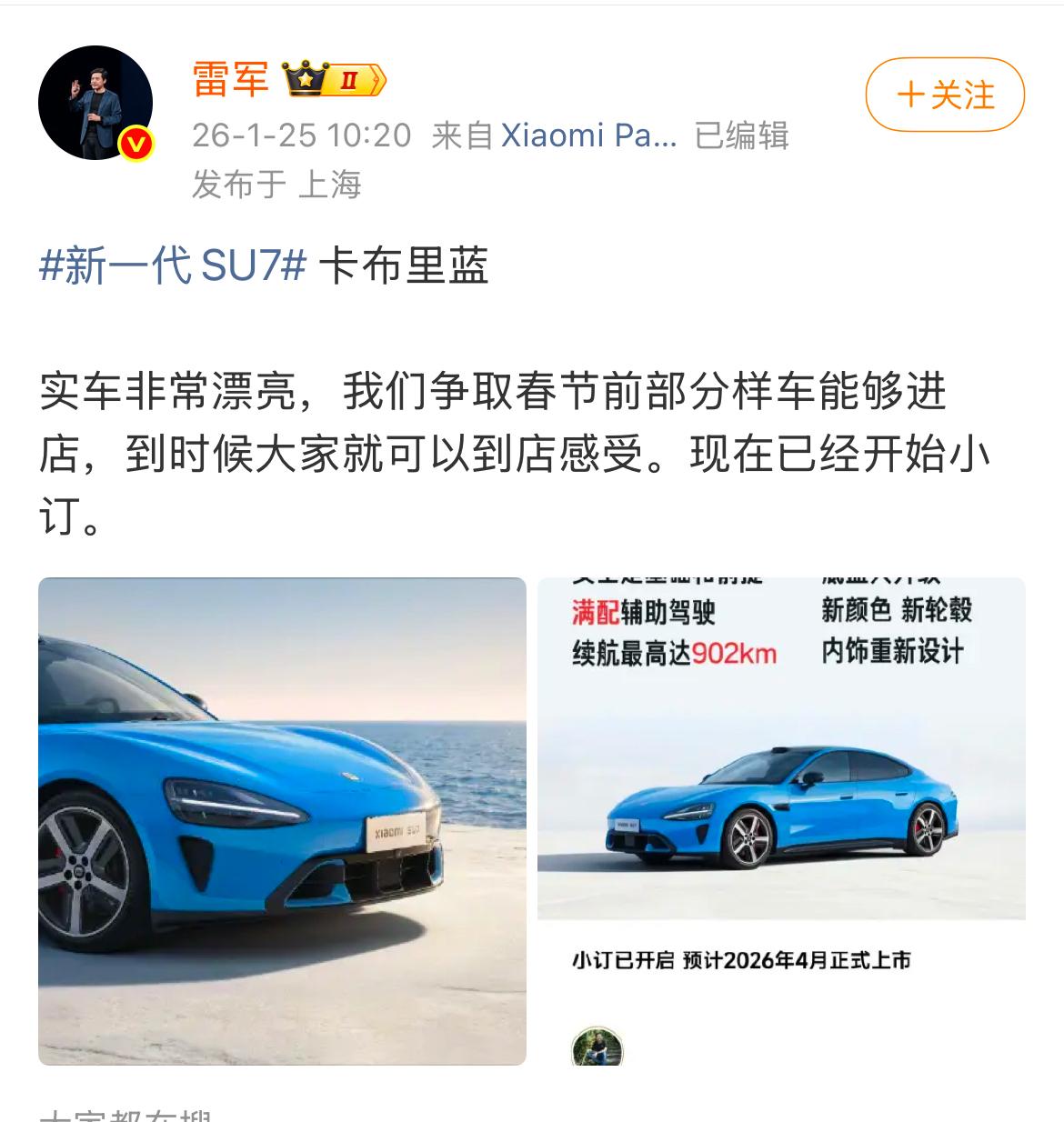 终于等来了雷总的承诺,小米新一代su7已经开始小订,但到了现在也没有看到实车,估计很多用户都很心急,看颜色不能只看图啊。这下好了,雷总承诺争取春节前部分样车到店,到时候就可以去小米之家看到“卡布里蓝”了。还可以深度体验,不过颜值这一块,还是那句话,依然是死死拿捏,这一点小米目前遥遥领先~