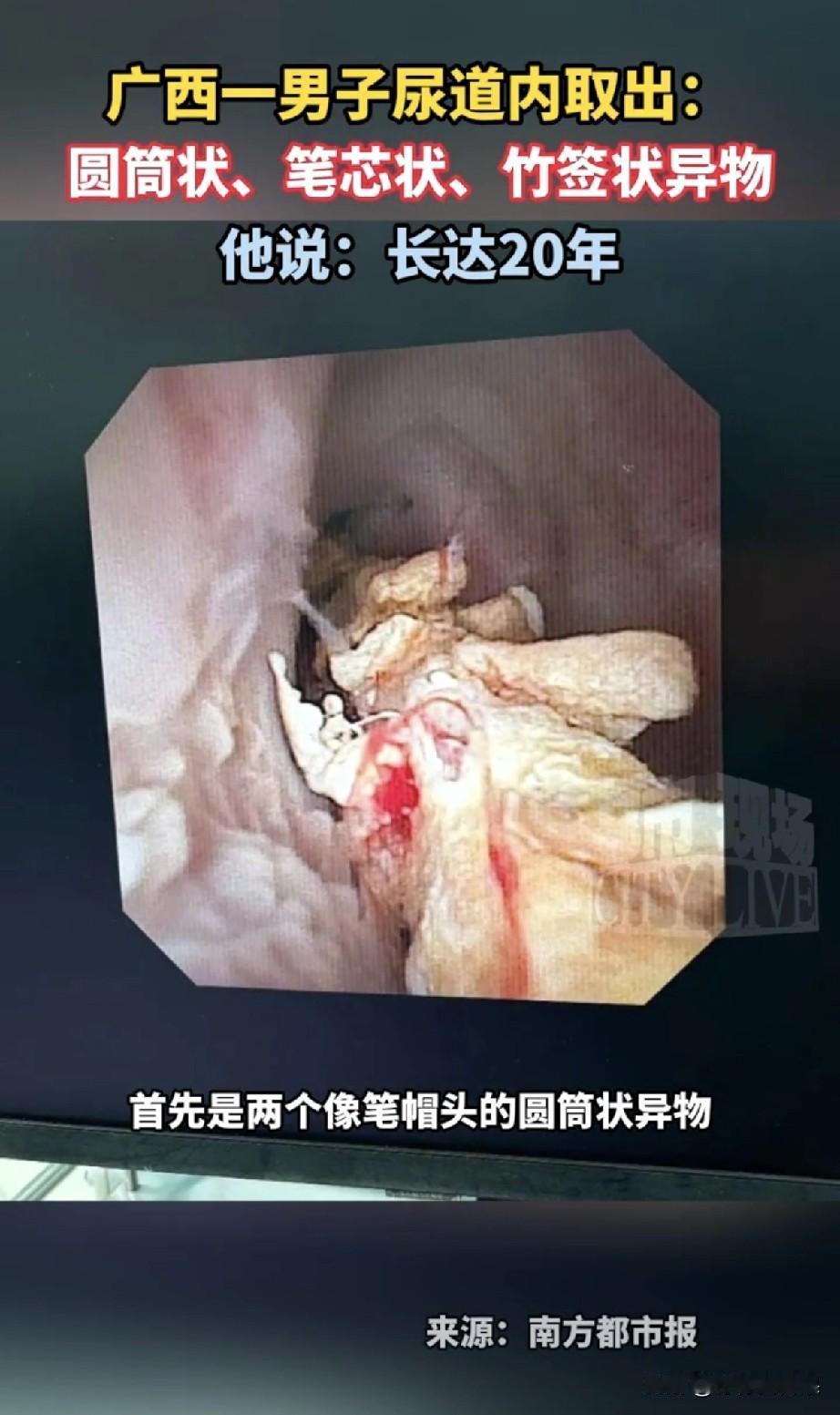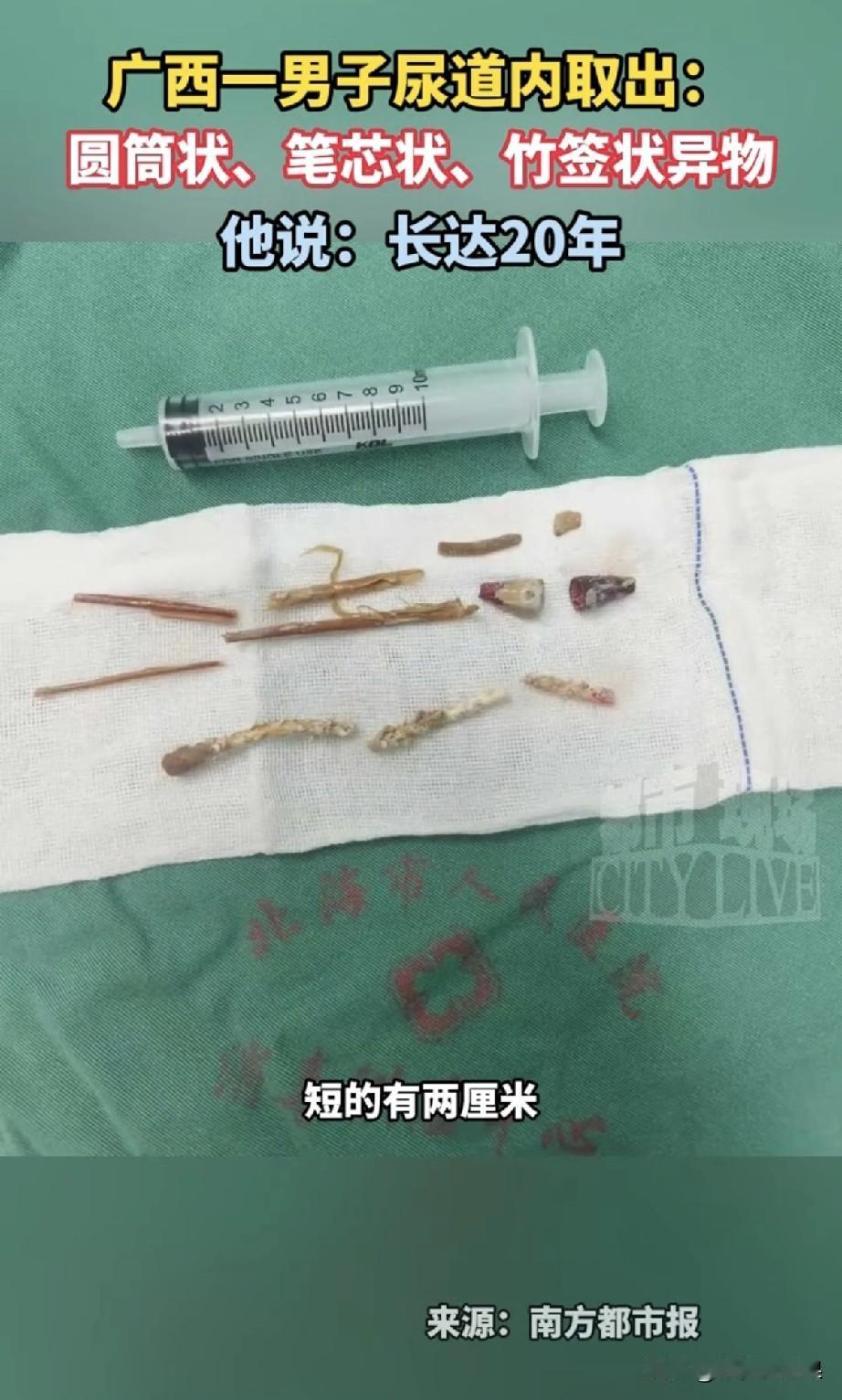广西有位大哥,硬生生把“好奇害死猫”这句话演成了现实。20年前,他突发奇想把笔帽、笔芯、竹签往尿道里塞,结果塞进去就取不出来了。 更绝的是,他怕被人当成变态,愣是咬着牙扛了20年!这20年里,尿痛、尿不尽成了家常便饭,愣是一声不吭,主打一个“自己造的孽自己扛”。 直到最近疼到根本尿不出来,才捂着裆部冲进医院。医生一检查,当场瞳孔地震——这尿道里哪是生病,简直是开了个“迷你垃圾场”! 手术台上,医生夹出一堆长短不一的“古董级”碎片,最短的都有2厘米,有的还跟肉长在了一起。医生说:“再晚来几天,尿道都要烂穿了,这哪是憋尿,简直是憋炸弹!” 咱就是说,大哥你这好奇心也太费身子了!有这毅力,当年去拧魔方都能拿冠军了,何必跟自己的尿道过不去呢?最后友情提示:身体是自己的,好奇别瞎作,出了问题赶紧看医生!