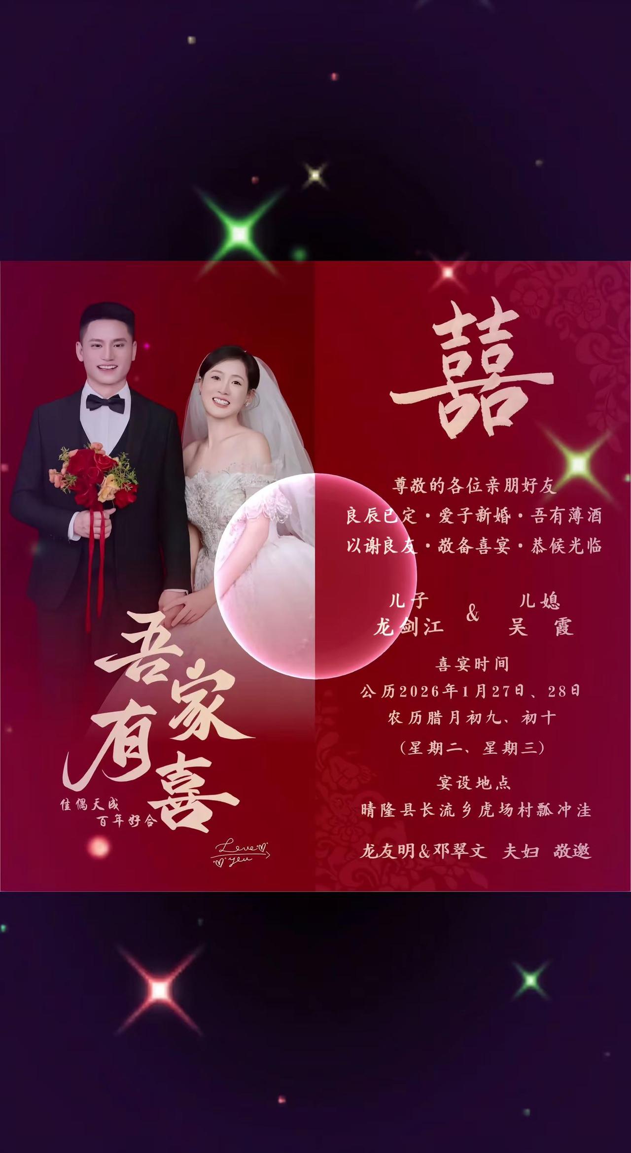 亲爱的亲朋好友:吾家小儿龙剑江与儿媳吴霞将于(2026年1月27日至28日,农历腊月初九至初十)在长流乡虎场村坳上组(漂冲洼)举行婚礼,诚邀您的光临。我们期待您的到来,共同见证这份幸福!