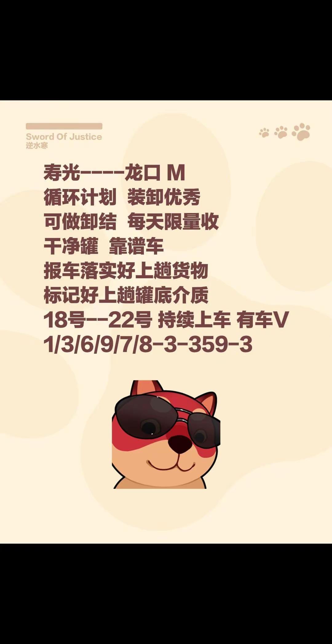 优质物流动向。寿光----龙口 M 循环计划 装卸优秀 可做卸结 每天限量收干净罐 靠谱车 报车落实好上趟货物标记好上趟罐底介质18号--22号 持续上车 有车V1/3/6/9/7/8-3-359-3油罐车 危险品物流运输 危险品罐车 成品油运输