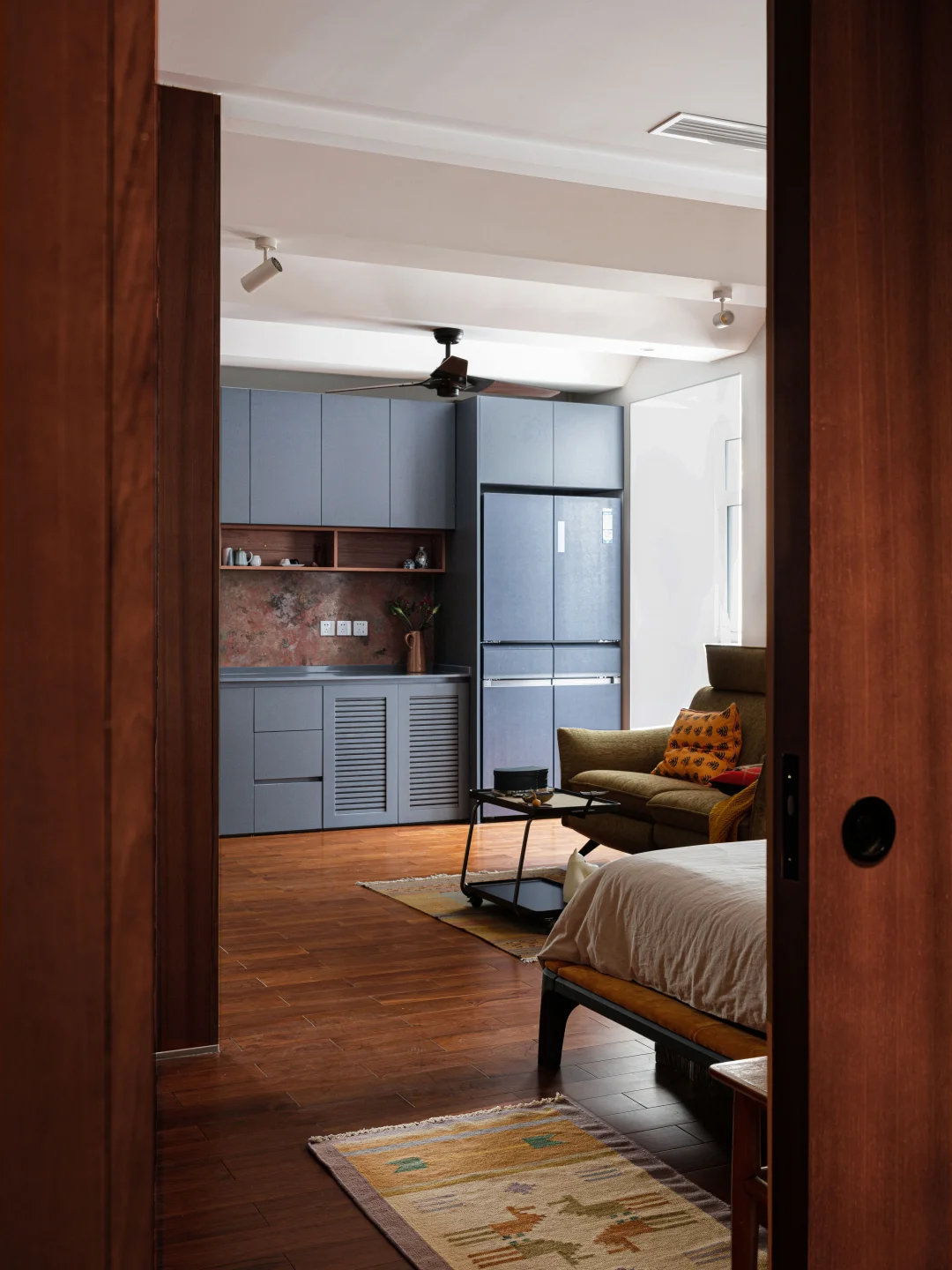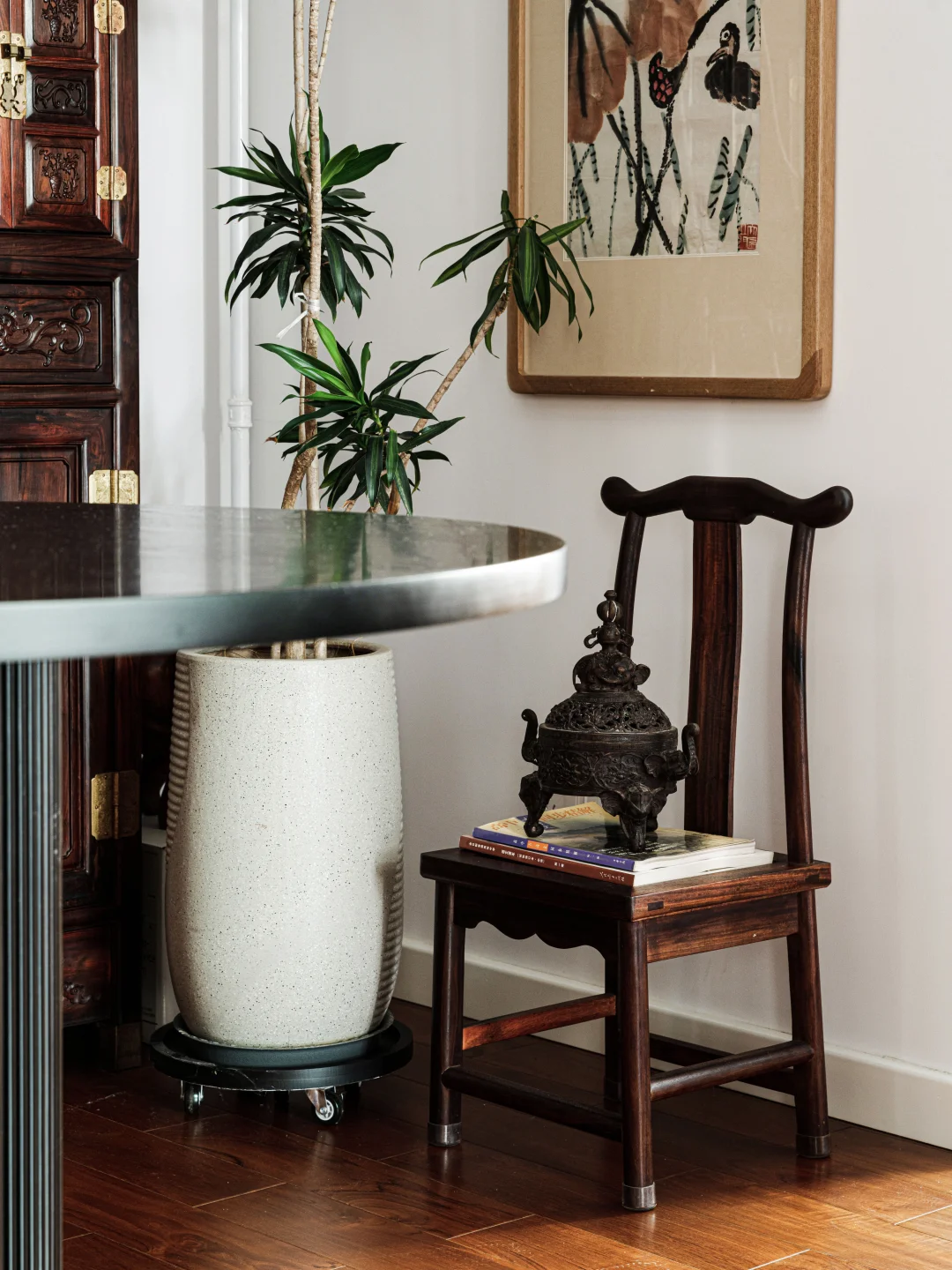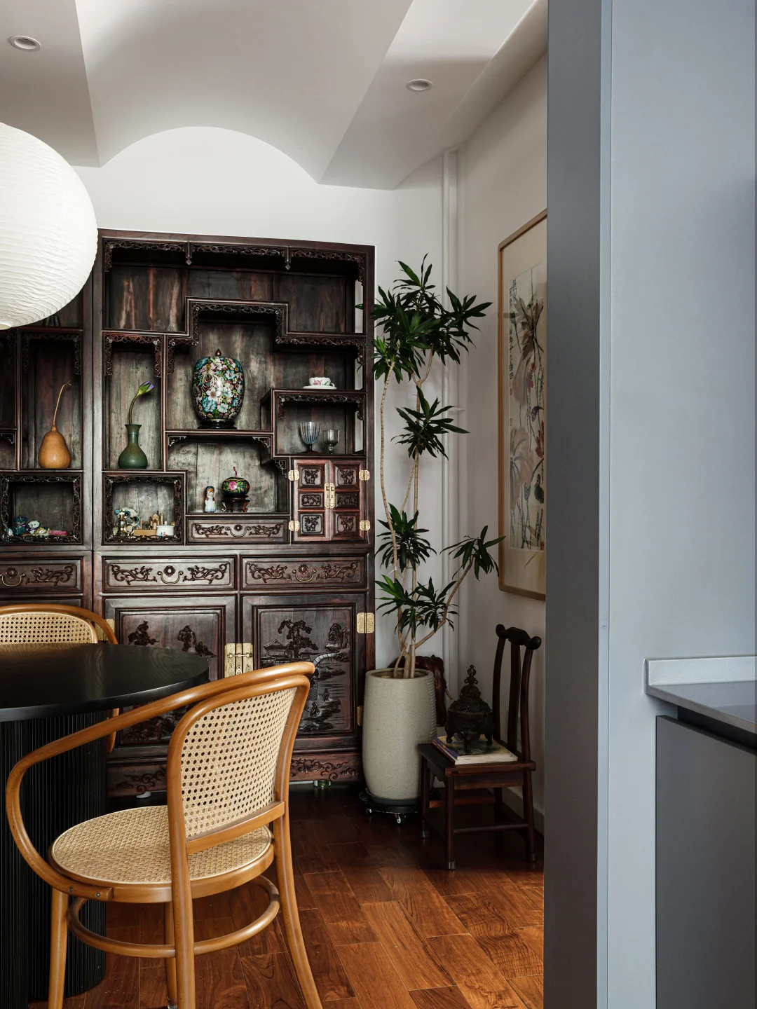 这是我们落地北京的家, 屋主非常喜欢中式的家具, 于是把爸妈家的老家具全都搬了过来 餐厅的中式博古架经过重新打磨、刷漆后, 完美地融入了新家,也有着自己独特的韵味, 我们还用中式屏风改的门来代替实体墙, 在打开、关闭之间切换不同使用场景, 打破了一成不变的封闭式格局, 如果你也不想要千篇一、美的雷同的家, 中西新旧混搭就是个不错的思路~