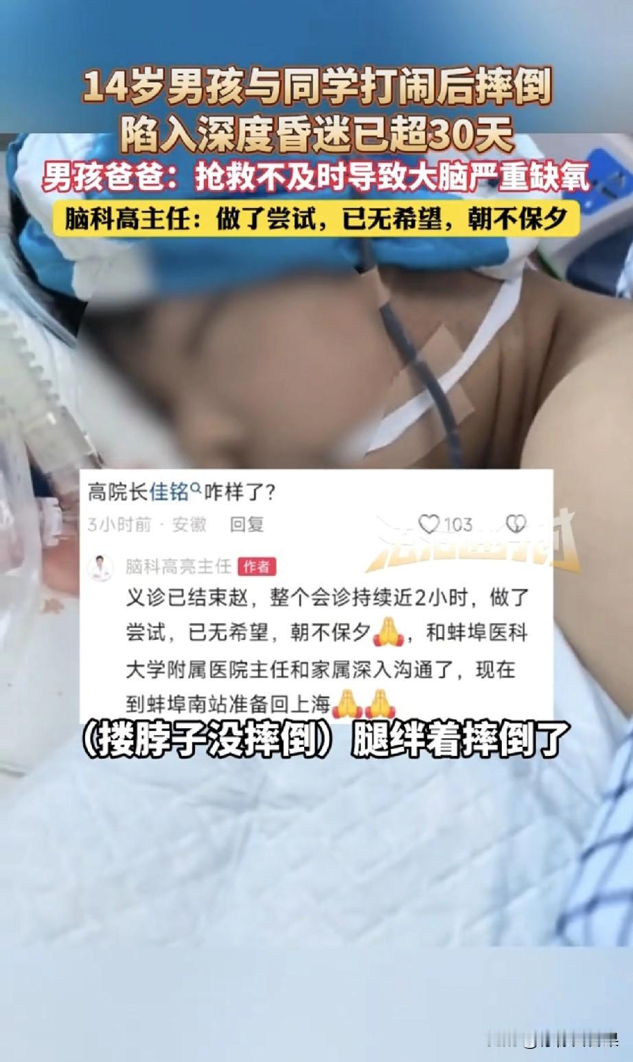 蚌埠14岁少年被搂脖绊腿摔倒,昏迷超30天脑死亡!高主任:已无希望,随时可能离世。 安徽蚌埠,14岁的他只是和同学闹着玩,被搂脖子、绊了一下,头磕在地上就再也没醒过来。 30多天了,他躺在ICU里深度昏迷,大脑因为缺氧已经彻底坏死。医生说:“没希望了,随时可能走。” 孩子爸爸跪在病床前哭到发抖:“如果当时抢救能快一点……我的娃就不会变成这样!” 谁能想到啊!就课间那点儿小打小闹,竟成了一个家的灭顶之灾! 谁又能料到啊!小时候咱都玩过的“绊一下”,直接把孩子推向了鬼门关! 刷到这条的家长,赶紧去跟你家娃说清楚! ❌ 绝对不许跟同学玩搂脖子、绊腿、推搡这一套!太危险了! ❌ 真有人摔倒了,别愣着!第一时间喊老师、打120!黄金4分钟真能救命! ❌ 别让一句“开玩笑”,变成一家人一辈子的心头刺! 求大家转发!让更多家长和孩子看到!别再让这种悲剧重演了🙏