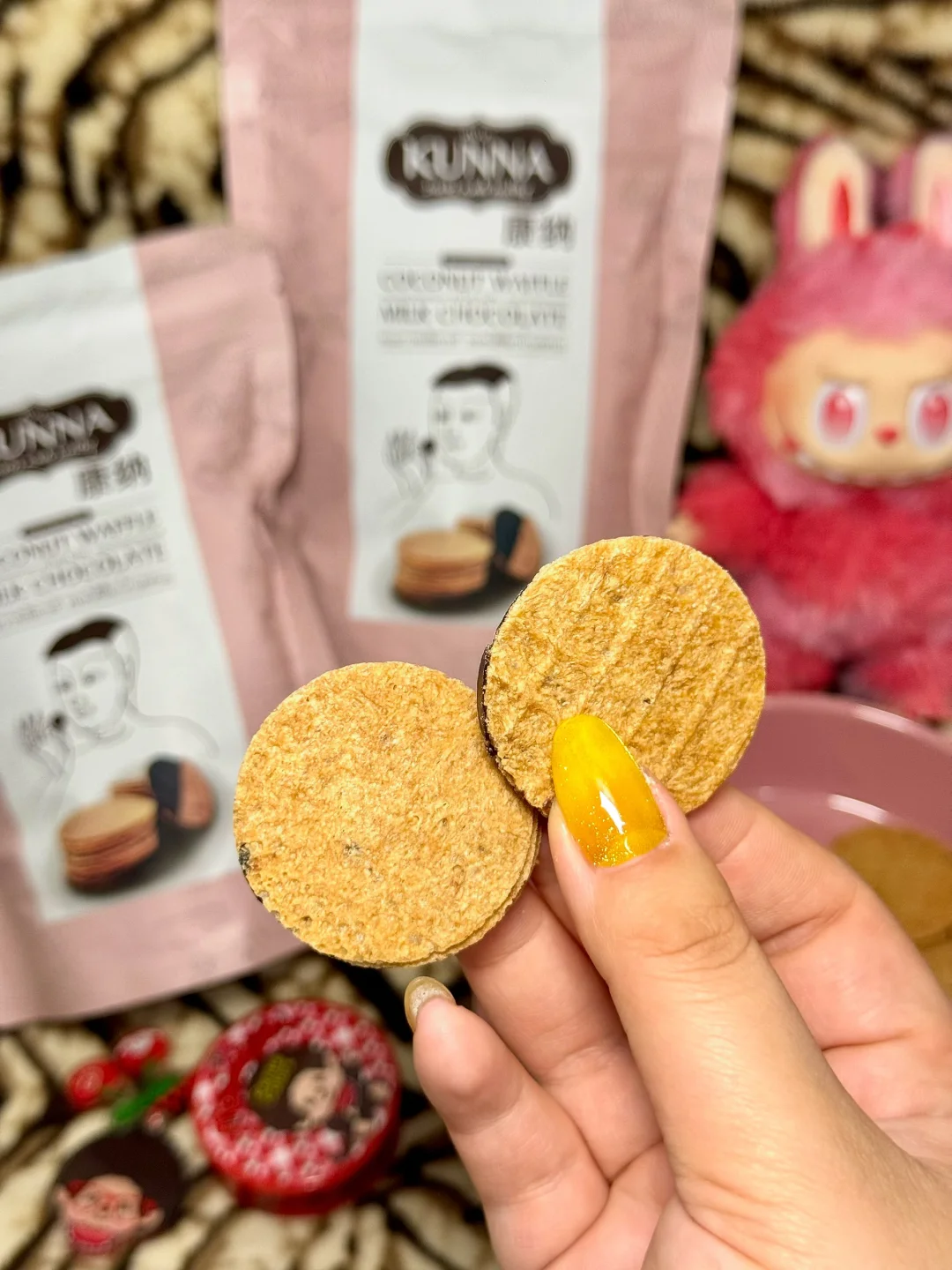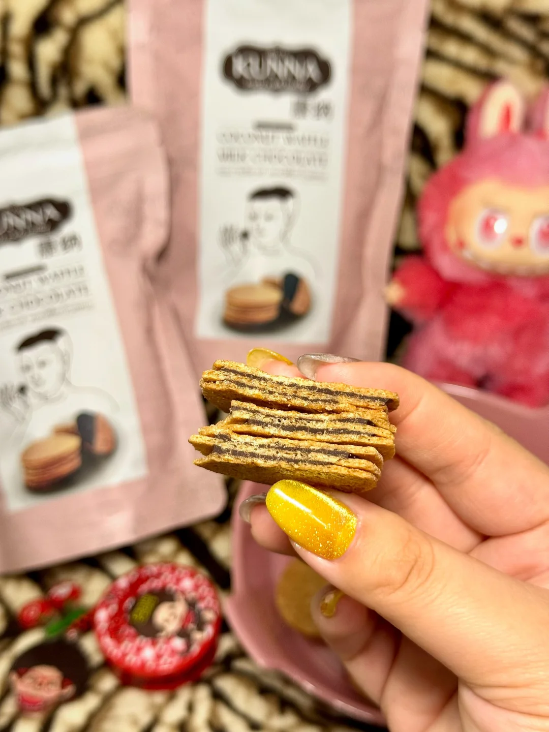 三层薄华夫夹满牛奶巧克力馅,咬下去咔嚓脆,巧克力在嘴里化开,浓椰香+可可香真的绝了,层次超丰富~