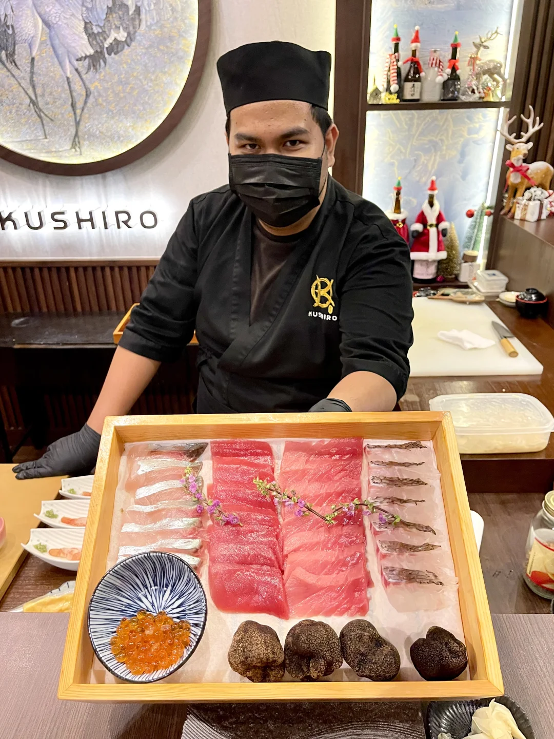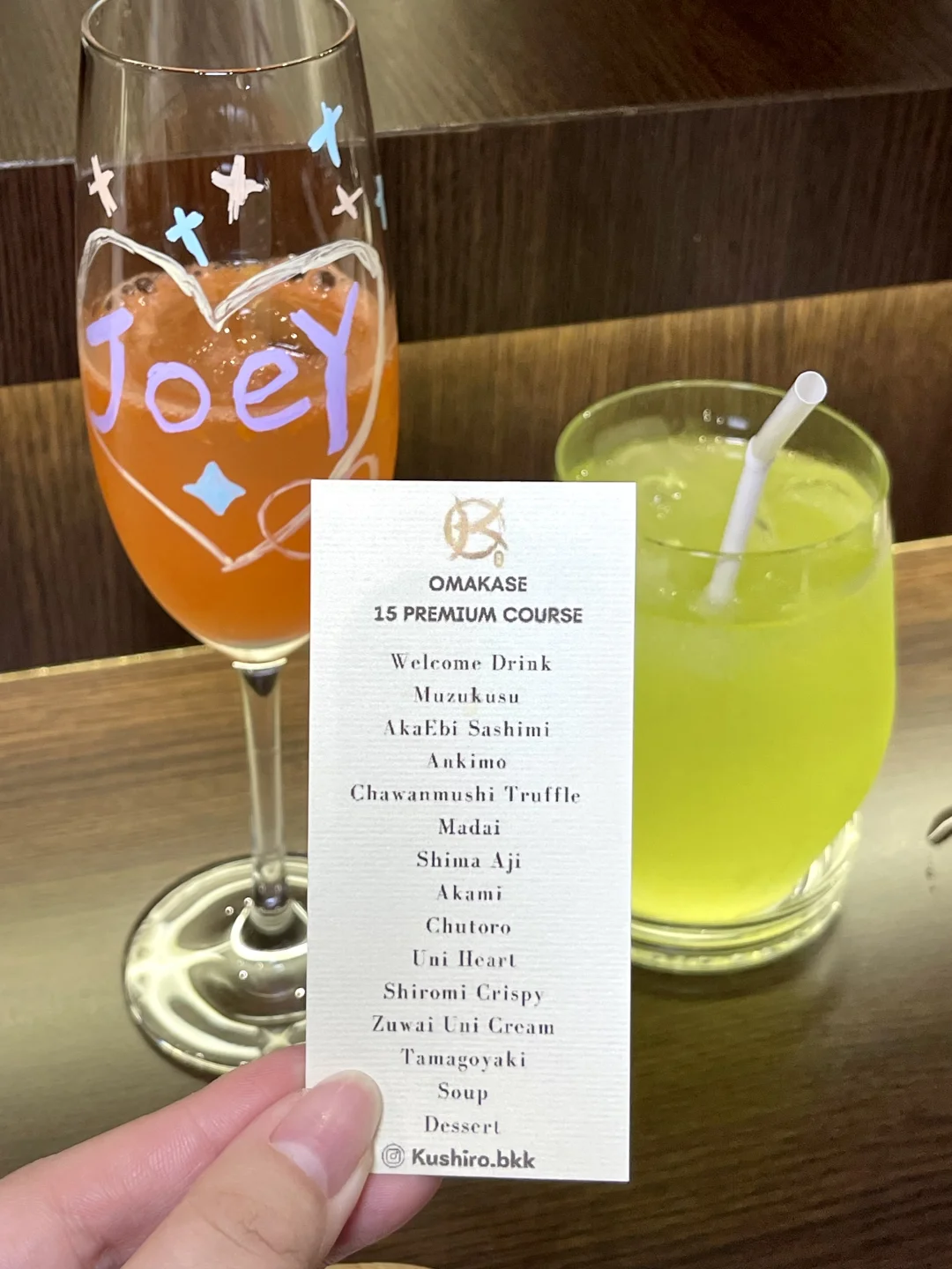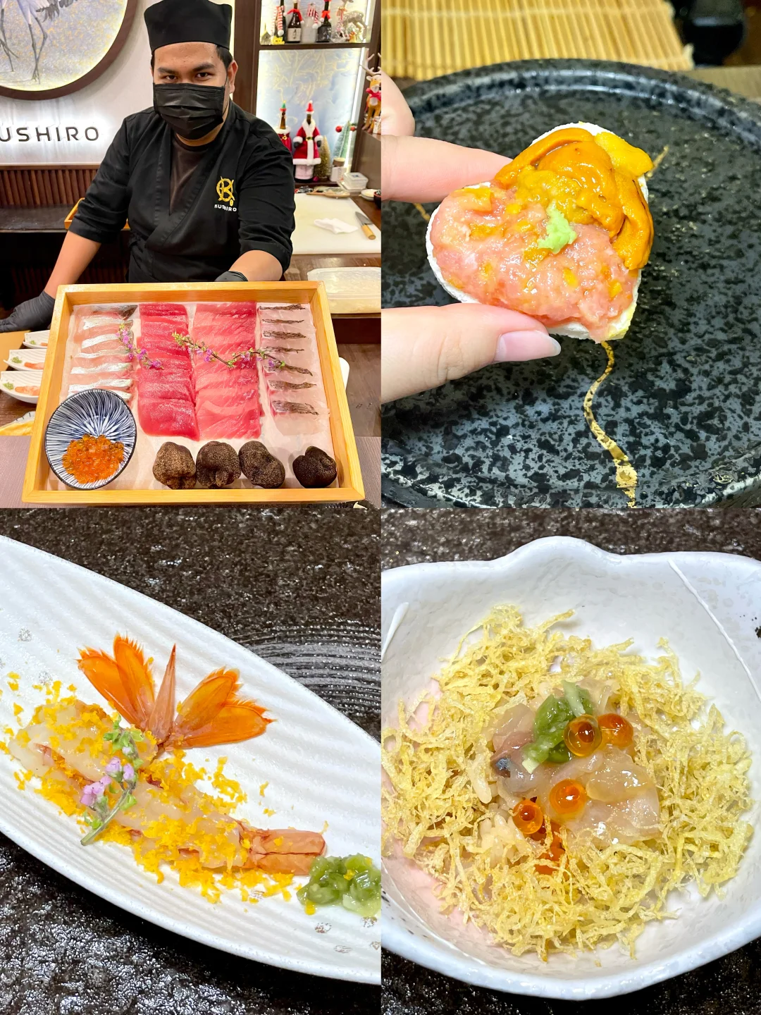 在曼谷挖到的宝藏日料店,三刷依旧惊喜满满💕 15道omakase套餐人均仅400r‼️性价比直接拉满😋 食材新鲜度超预期,Madai真鲷清甜弹牙,Akami金枪鱼赤身细腻回甘‼️金箔点缀仪式感十足,每一口都是味蕾暴击😋 杯子DIY涂鸦太戳女生,拍照发圈秒获赞☺️吧台座位能近距离看主厨捏寿司,治愈感满分💯不管约会还是闺蜜聚餐都超适配,来曼谷别错过这家‼️ 🍱:Kushiro Omakase and Japanese Dining