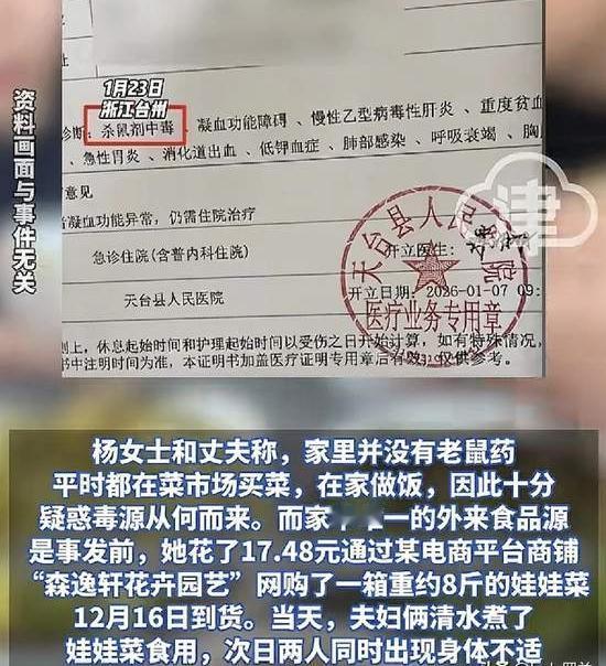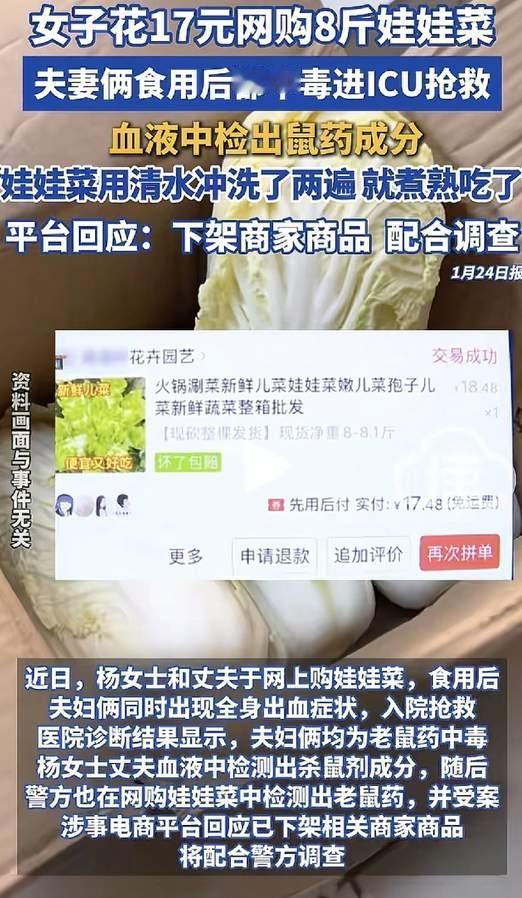 网购17块钱娃娃菜,两口子吃出“全身喷血”!这商家是想干啥嘛? 浙江天台这对夫妻,就因为煮了一盘网购的娃娃菜,第二天直接“血崩”!鼻子嘴巴像拧开的水龙头,血止不住地往外飙,血管干瘪得连医生都抽不出一滴血! 不可思议哇,这17块4毛8的菜里,竟然藏着剧毒鼠药(溴鼠灵)? 好家伙 警方一查,这毒竟然是商家“送”的!为了省那几分钱包装费,这缺德玩意儿竟然用沾了老鼠药的旧报纸包菜!“这是把顾客当老鼠毒啊? 出事前杨女士去质问商家,对方还嘴硬得像茅坑里的臭石头:“仓库地里都没老鼠药,你别想讹我!” 结果现在人进了ICU,商家立马注销店铺、连夜跑路,玩起了人间蒸发! 哎为了蝇头小利,差点害死人! 这种黑心商家真该好好查查了,不然谁敢放心吃放心买是不是火爆娃娃菜 。还有平台也是该查查该改改都不能马虎,得行动起来才行,这可是人命关天的大事啊。 蔬菜水果中毒