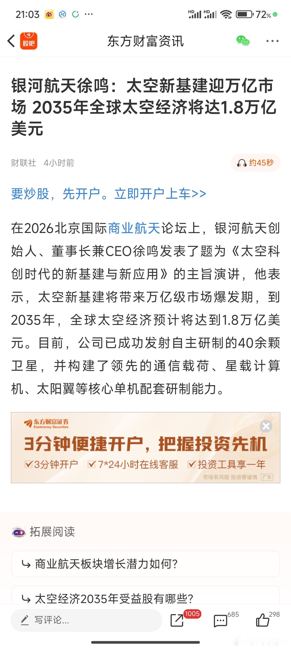银河航天徐鸣:太空新基建迎万亿市场2035年全球太空经济将达1.8万亿美元