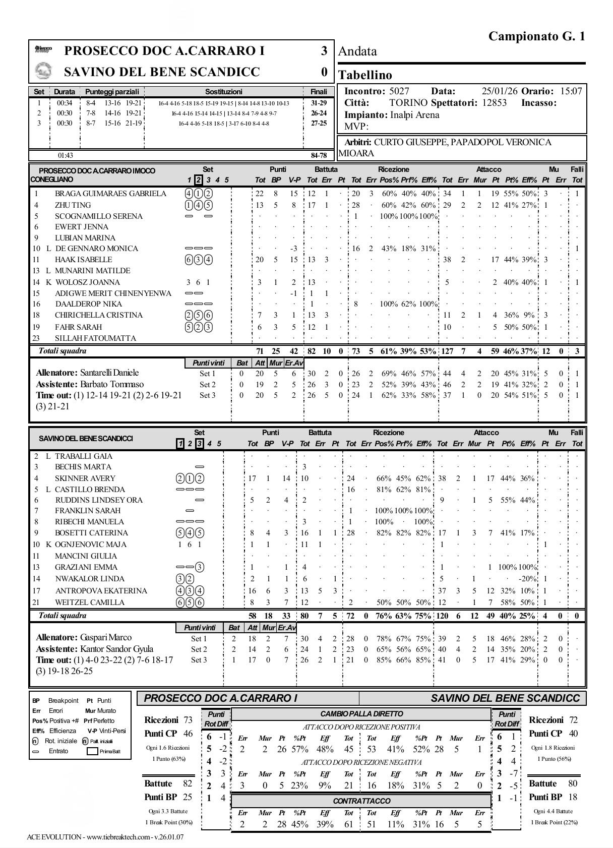 迈过冠军坎,科内3-0斯坎迪奇夺得意大利杯 2026年意大利杯女排决赛,科内利亚诺3-0战胜斯坎迪奇夺得意大利杯,这是科内利亚诺连续第七次捧杯,也是连丢超级杯和世俱杯后的本赛季首冠。虽然3-0战胜对手,但过程并不轻松,每局都打到25分以上(31-29, 26-24, 27-25),可以说,科内终于在本次杯赛中迈过了这个赛季的冠军坎,意义非凡。朱婷在本场比赛中,多次在关键时刻发挥作用,每一个胶着的局末,或防守或重扣,为科内艰难取胜立下奇攻。 科内利亚诺: 加比34扣19中1失1被拦、3拦0发22分 哈克38扣17中2失0被拦、3拦0发20分 朱婷29扣12中2失2被拦、1拦0发13分 奇里切拉11扣4中2失1被拦、3拦0发7分 法尔10扣5中0失0被拦、1拦0发6分 沃沃什5扣2中0失0被拦、1拦0发3分 斯坎迪奇: 斯金纳38扣17中2失1被拦、0拦0发17分 安特罗波娃37扣12中3失5被拦、1拦3发16分 韦策尔12扣7中0失1被拦、1拦0发8分 波塞蒂17扣7中1失3被拦、0拦1发8分 鲁丁斯9扣5中0失1被拦、0拦0发5分 恩瓦卡洛5扣0中0失1被拦、1拦1发2分 奥格涅诺维奇1扣0中0失0被拦、1拦0发1分 格拉齐亚尼1扣1中0失0被拦、0拦0发1分 科内利亚诺-斯坎迪奇: 扣球得分:59-49 拦网得分:12-4 发球得分:0-5 对方送分:13-20 总得分:84-78 一传到位率:61%-76% 一传完美率:39%-63% 科内朱婷