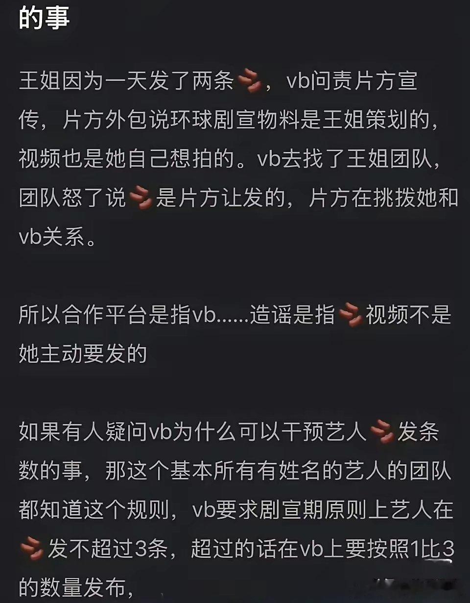 搞明白王玉雯停剧宣的原因了!这里面没陈星旭的事儿,王姐就是太刚了…因为王玉雯一天发两条抖剧宣,片方被微博问责,原则上艺人剧宣期不能在抖发超过3条相关视频。但片方的外包团队说环球影城的剧宣是王玉雯提出要拍的,直接甩锅王玉雯团队。微博平台又去找王玉雯,王姐团队直接怒了,称明明是片方让发的。王玉雯团队认为宣发团队在挑拨她和微博平台之间的关系。目前宣发团队的某位工作人员已经被辞退。