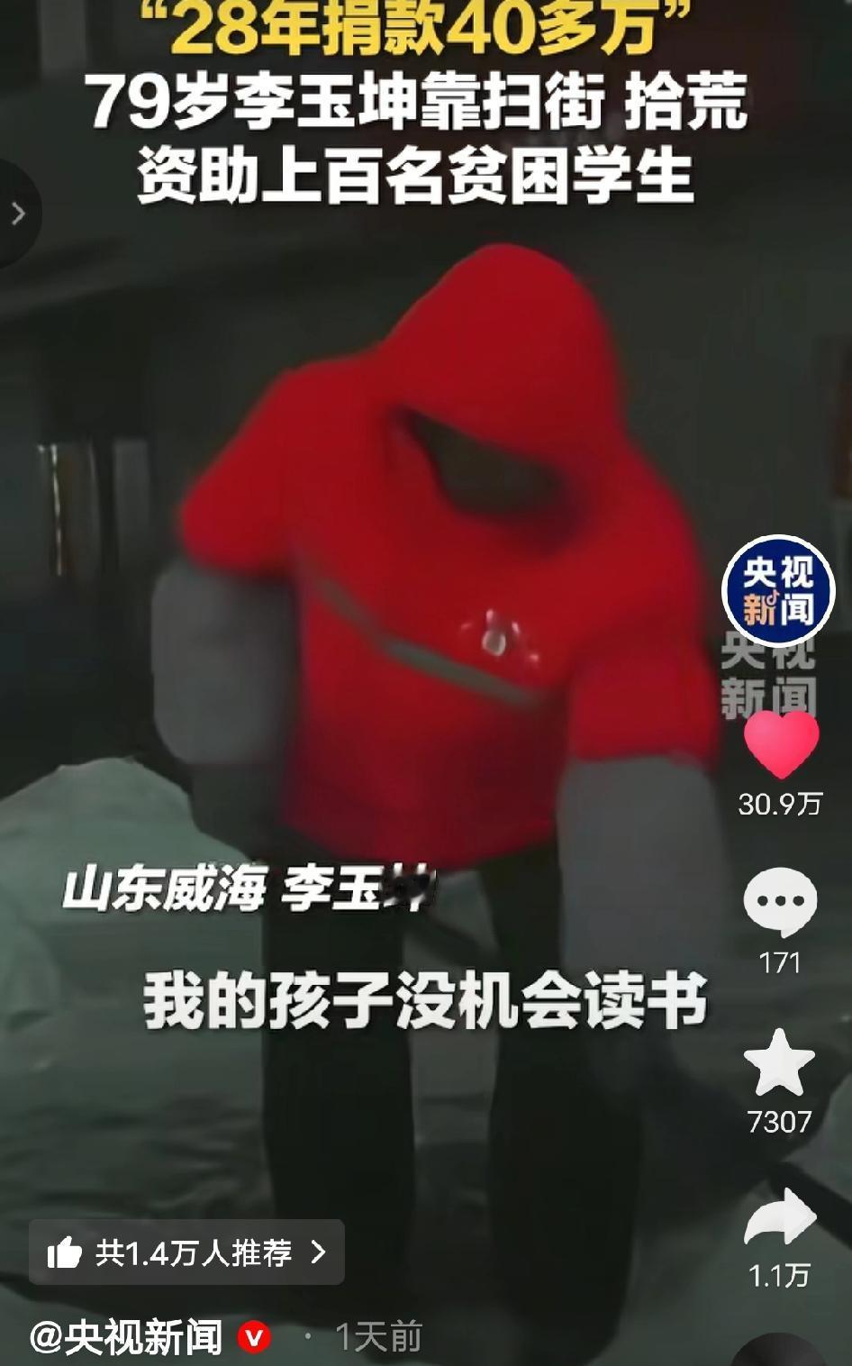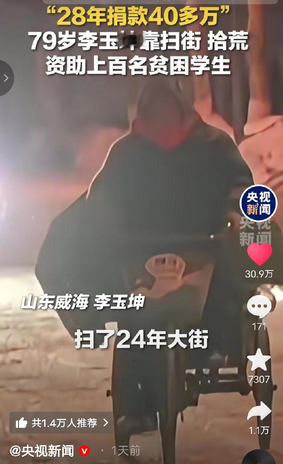 央视点赞了!山东威海79岁的环卫工靠扫街、拾荒28年累计捐款超40万元,自己却住在漏风的老屋里,穿着补了又补的旧衣服!她说:“我扫街攒的钱,能让孩子们读书,值!” 1998年,51岁的李玉坤成了一名环卫工人,每月工资只有800元。那时她刚经历丧子之痛,看着村里因交不起学费而辍学的孩子,想起自己年轻时因为家里穷,只读过3个月书的遗憾,便暗下决心:“我扫街挣的钱,要让更多孩子能上学。” 1999年,她捐出了第一笔3200元——那是她熬夜给外贸厂刻花边5年的积蓄,加上上级发的2000元奖励,她一分没留,全部寄给了希望工程。此后的28年里,她的工资、拾荒卖废品的钱,甚至政府发放的5万元养老金、社会资助的6.85万元,全都变成了一张张皱巴巴的汇款单,寄给了全国各地的贫困学生。 她最初以“李伯伯”的匿名身份资助,受助的小康同学一直以为资助自己的是位坐办公室的干部。直到2018年,小康拿着大学录取通知书找上门,才发现“李伯伯”竟是一位满头白发、穿着洗得发白的环卫服、正在街边扫落叶的老奶奶,当场哭着给她鞠了一躬:“奶奶,我终于找到您了!” 如今79岁的李玉坤,依然每天凌晨4点起床,推着扫帚走街串巷。她住的老屋墙皮脱落,冬天漏风,夏天漏雨,家具还是几十年前的旧物:一张掉漆的木桌,一个裂了缝的瓷碗,身上的棉袄补了三层补丁,鞋子是捡来的旧运动鞋,鞋底磨平了就垫上几层硬纸板。 有一次社区干部给她送来新棉袄,她转身就寄给了山区的孩子,笑着说:“我一个老太婆,能穿暖就行,孩子们比我更需要。”除了资助学生,她还在非典、南方雪灾、玉树地震、新冠疫情中主动捐款,甚至立下遗嘱:去世后捐献遗体,为医学研究做贡献。 至今,她资助的100多名学生里,有的成了乡村老师,有的当了医生,都在传递着她的善意。去年冬天,受助的学生们凑钱给她买了一台电暖气,她却又把电暖气捐给了村里的独居老人。 网友评论 - “扫街攒下的每一分钱,都变成了孩子们的学费,这才是最伟大的人!” - “奶奶自己舍不得花一分钱,却把所有的爱都给了陌生的孩子,看哭了!” - “最朴素的人做最伟大的事,这才是真正的中国好人!” - “奶奶的善良,比任何财富都珍贵,愿她健康长寿!” 28年的坚持,40万的捐款,一位环卫工奶奶用行动告诉我们:善良从来与贫富无关。你身边有这样默默奉献的普通人吗? 79岁环卫工奶奶捐款40万资助学生 暖心民生 威海正能量 中国好人李玉坤 央视新闻报道 来源:央视新闻