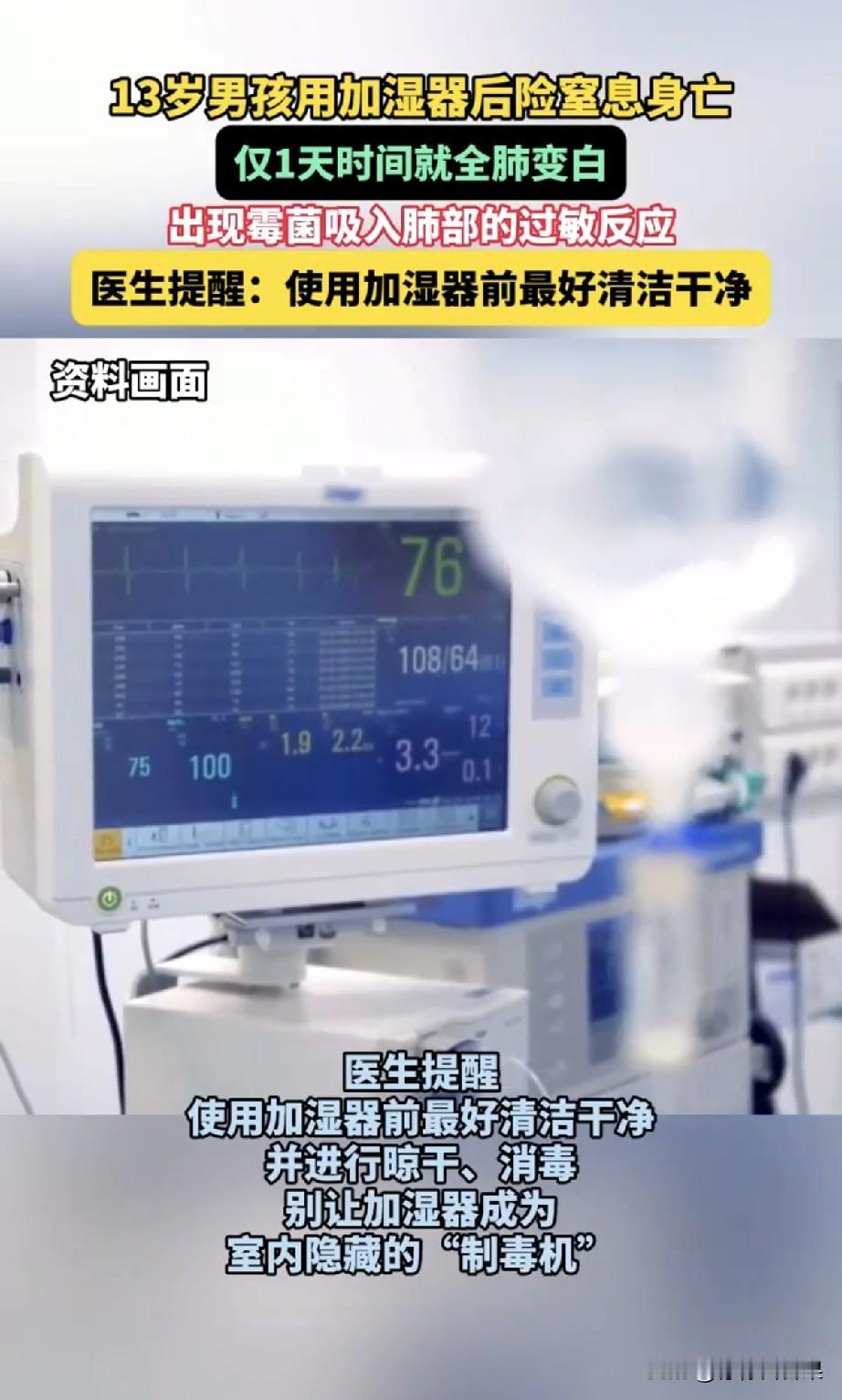 河南13岁男孩因使用不当加湿器,双肺全白被送ICU抢救! 家人们,刷到这条的赶紧停下手里的事!这可不是危言耸听,是真实发生的事。 河南一名13岁男孩,因为家里的加湿器长期没清洗,家人直接就加了自来水使用。结果才一天时间,孩子就突然高烧不退、呼吸困难,送到医院一查,双肺已经全白,直接被送进ICU抢救! 医生说,这就是典型的“加湿器肺炎”。长期未清洗的加湿器里,藏着大量霉菌、水垢和细菌,被水雾吹出来后,直接被孩子吸进了肺里,引发严重过敏反应和肺部感染。 👉 冬天用加湿器,这几条保命守则一定要记牢: 1. 勤清洗:至少每3天拆洗一次水箱和滤网,别让细菌在里面开“派对”。 2. 用对水:别加自来水!要用纯净水或凉白开,减少水垢和微生物。 3. 别一直开:每天开3-4小时就够了,太湿也容易滋生细菌。 4. 定期换水:水箱里的水别留到第二天,当天用完当天换。 别再让你家加湿器变成“制毒机”了!赶紧转给家人朋友,尤其是有娃的家庭!