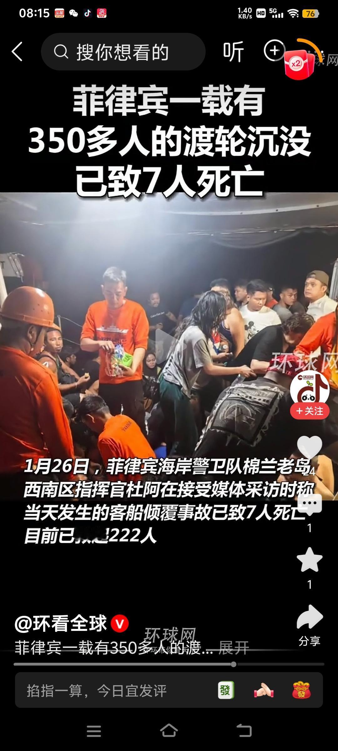 菲律宾又一艘渡轮翻船沉没,菲律宾恩将仇报的行为让人有点相信因果报应了。 1月23日,菲律宾一艘货轮在中国黄岩岛海域翻船,就在中国军警全力救起菲律宾21名落水船员中的17名船员时,菲律宾军方却宣布封锁中国黄岩岛海域70天,好让菲律宾进行军事演习。菲律宾的行为让人惊掉下巴,说不出话来。 岂料就在1月26日,菲律宾南部海域一艘载有350人的渡轮,又翻船沉没。目前确认有7人死亡,222人获救,剩余落水人员还在搜救中。 唉!本来菲律宾出现翻船事故应当让人同情,并给予帮助的。但菲律宾翻脸无情恩将仇报的行为,又让人有点儿相信因果报应了。
