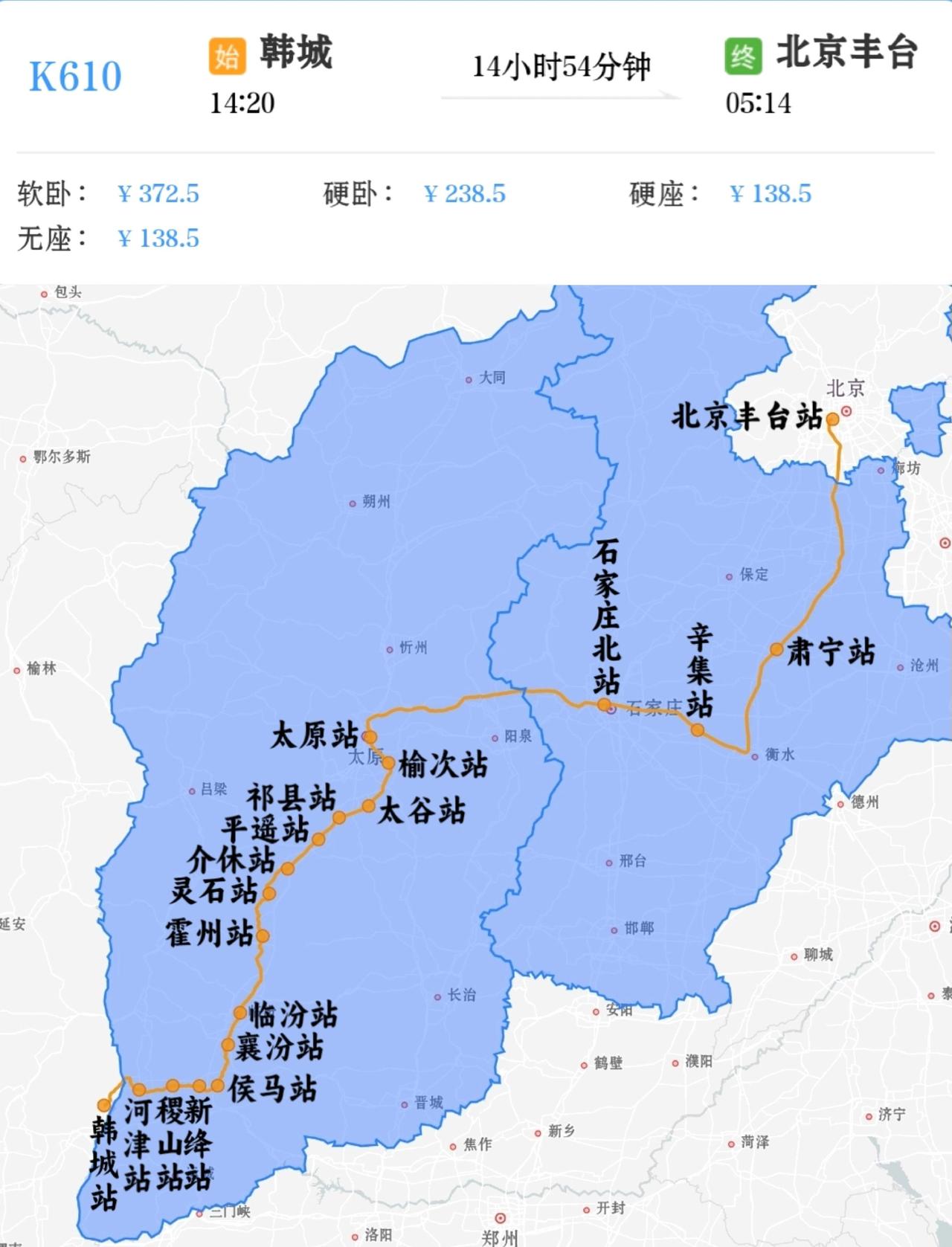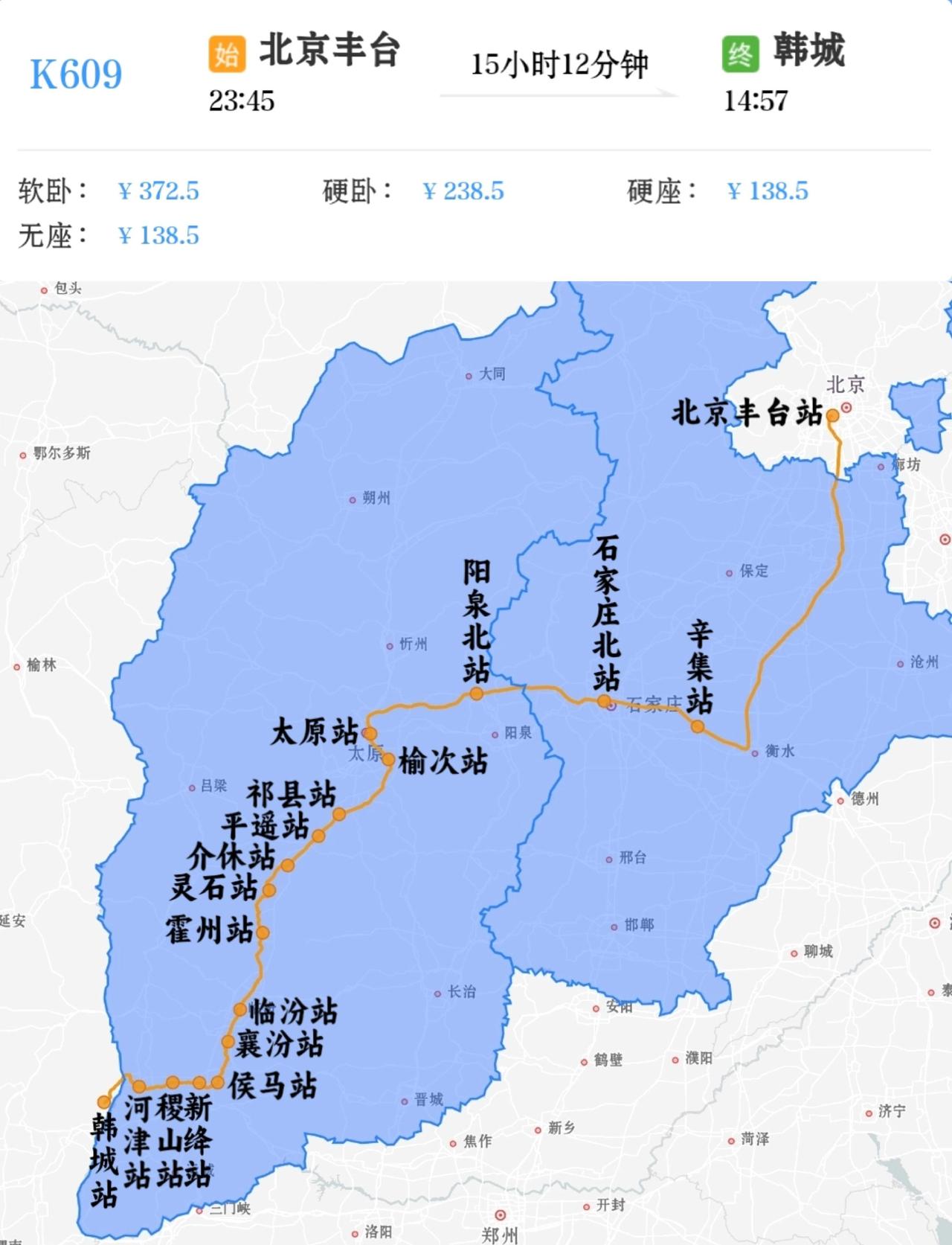 2026年1月28日起韩城到北京丰台K610次列车增加停靠石家庄北站。 2026年1月28日起北京丰台到韩城K609次列车增加停靠石家庄北站,北京丰台站23点45分开,第二天凌晨4点34分到石家庄北站。