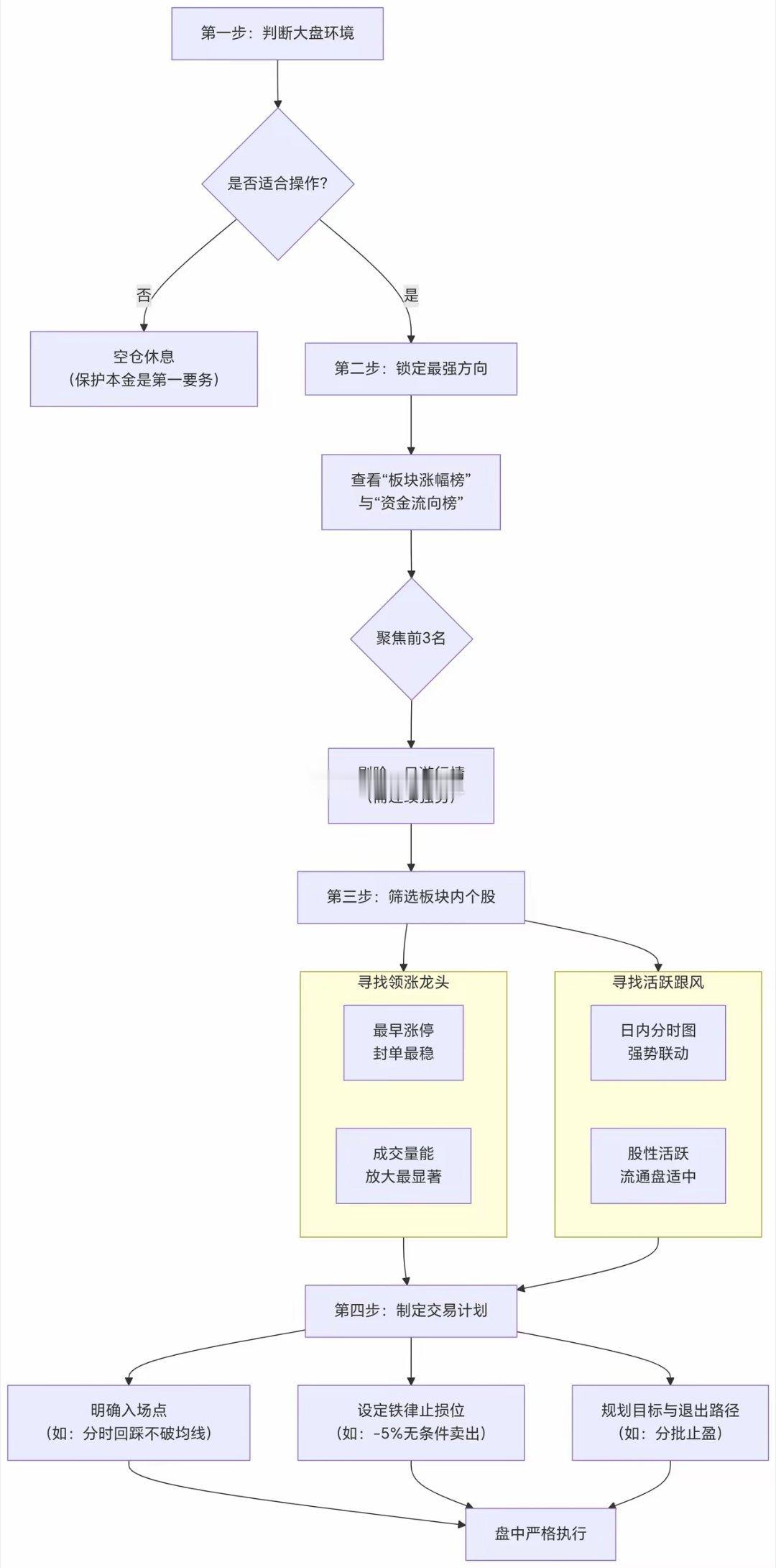 股票短线交易,怎么选股短线交易选股如同“特种作战”,目标不是找最好的公司,而是找短期内动能最强、关注度最高的标的。关键在于建立一套高效、可重复的筛选流程,并严格执行。下图概括了从判断时机到具体执行的完整流程: 见底部流程图💡 短线选股的具体标准与技巧在完成上述流程后,可运用以下更具体的标准筛选:1. 核心标准:量价齐升,动能最强 · 放量是灵魂:寻找近期(1-3天内)成交量突然持续放大(例如,达到前期均量2-3倍以上)的个股。量代表资金进场意愿。 · 价格突破关键位置:股价最好能突破近期明显的高点平台、重要均线(如20日线)或下降趋势线,显示上升阻力最小。2. 核心标准:聚焦市场最强焦点 · 板块效应:只选择 “当天资金流入排名前3”或“涨幅榜前3” 板块中的个股。短线资金合力是股价短期上涨的最大推手。 · 龙头优先:在同一热点板块中,优先选择最先涨停、涨停封单最坚决、涨停后带动效应最明显的股票。它通常是这波行情的风向标。3. 辅助标准:技术形态与股性 · 形态紧凑:上涨前,股价最好经历过一段时间的震荡缩量盘整,筹码结构稳定。 · 股性活跃:选择历史上涨停次数较多、出现涨停后次日有溢价惯性的个股。避免选择那些长期低迷、波动率极低的“僵尸股”。⚠️ 短线交易的生命线:风险控制这是区分普通散户与成熟短线交易者的核心。· 严格止损:必须在买入前就设定好明确的止损点(例如,买入价下跌5% 无条件卖出),并像机器一样执行。· 仓位管理:绝不在单只短线标的上投入过高仓位(如不超过总资金的20%),以应对判断错误。· 忘记成本:买入后,你的决策依据只能是股价走势是否仍符合预期,而不是“我被套了,想等解套”。🛠️ 适合普通投资者的高效工具· 用软件功能筛查:多数股票软件都有“条件选股”或“自定义板块”功能,可以设置“当日涨幅大于5%”、“成交量较前一日放大100%”、“所属板块资金流入前5”等条件进行初筛。· 关注“龙虎榜”:观察上榜个股是机构主导还是游资主导,以及买卖双方的力度,可作为资金强弱的参考。最后请牢记:短线交易是熟练工种,需要大量练习和反思。成功的短线交易者往往只做自己最熟悉、胜率最高的1-2种形态。建立你的模式,然后用纪律去执行它,远比追逐无数个代码重要。如果你能明确自己偏好的短线风格(例如,是做早盘强势股、还是做尾盘偷袭,或是做热点回调后的反包),我可以为你提供更具针对性的细节分析。