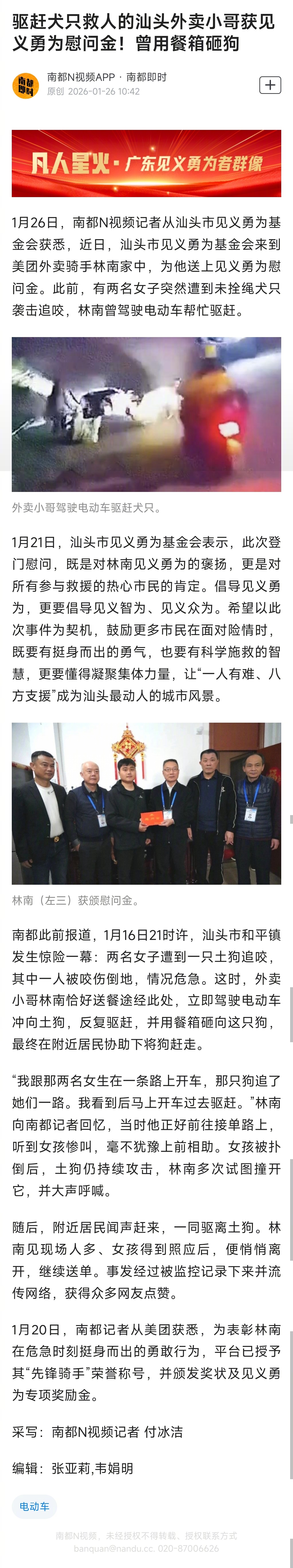 #汕头骑手多次挡犬救下两女生#【驱赶犬只救人的汕头外卖小哥获见义勇为慰问金!曾用餐箱砸狗】#外卖小哥驱狗救人获见义勇为慰问金#1月26日,南都N视频记者从汕头市见义勇为基金会获悉,近日,汕头市见义勇为基金会来到美团外卖骑手林南家中,为他送上见义勇为慰问金。此前,有两名女子突然遭到未拴绳犬只袭击追咬,林南曾驾驶电动车帮忙驱赶。1月21日,汕头市见义勇为基金会表示,此次登门慰问,既是对林南见义勇为的褒扬,更是对所有参与救援的热心市民的肯定。倡导见义勇为,更要倡导见义智为、见义众为。希望以此次事件为契机,鼓励更多市民在面对险情时,既要有挺身而出的勇气,也要有科学施救的智慧,更要懂得凝聚集体力量,让“一人有难、八方支援”成为汕头最动人的城市风景。南都此前报道,1月16日21时许,汕头市和平镇发生惊险一幕:两名女子遭到一只土狗追咬,其中一人被咬伤倒地,情况危急。这时,外卖小哥林南恰好送餐途经此处,立即驾驶电动车冲向土狗,反复驱赶,并用餐箱砸向这只狗,最终在附近居民协助下将狗赶走。“我跟那两名女生在一条路上开车,那只狗追了她们一路。我看到后马上开车过去驱赶。”林南向南都记者回忆,当时他正好前往接单路上,听到女孩惨叫,毫不犹豫上前相助。女孩被扑倒后,土狗仍持续攻击,林南多次试图撞开它,并大声呼喊。随后,附近居民闻声赶来,一同驱离土狗。林南见现场人多、女孩得到照应后,便悄悄离开,继续送单。事发经过被监控记录下来并流传网络,获得众多网友点赞。1月20日,南都记者从美团获悉,为表彰林南在危急时刻挺身而出的勇敢行为,平台已授予其“先锋骑手”荣誉称号,并颁发奖状及见义勇为专项奖励金。(采写:南都N视频记者 付冰洁)