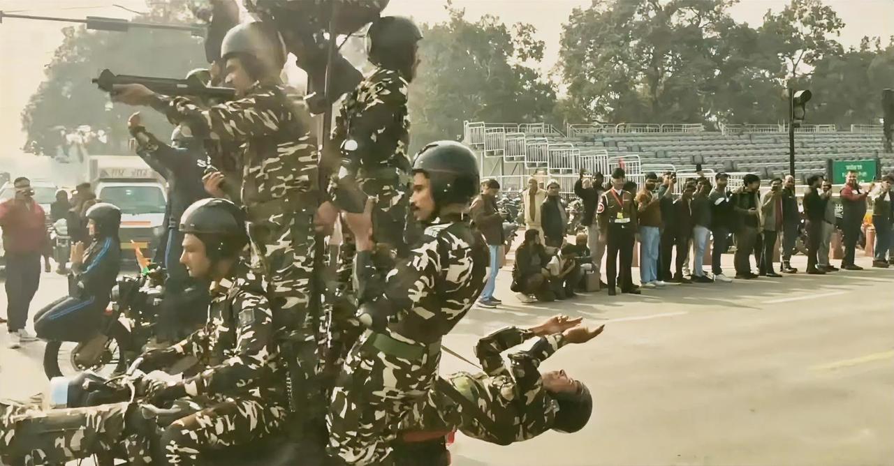 图片展现的是印度共和国日阅兵式彩排的的经典环节——摩托车特技表演,这一项目已经成为印度阅兵最具标志性的符号之一。 图中士兵以摩托车为平台,叠起多层人形结构,部分成员做出仰躺、持枪瞄准等特技动作,话说后面躺着的人是在干什么,虚空玩手机吗?节目效果?还是说给这个摩托车结构“配重”?又或是什么仪式的手势。 按照物理学来解释的话,摩托车叠罗汉时,上层多人站立会让重心上移、前移,躺着的士兵通过身体后仰、展开肢体,把重心向后、向下拉,抵消前方重量,防止车辆前倾或侧翻。