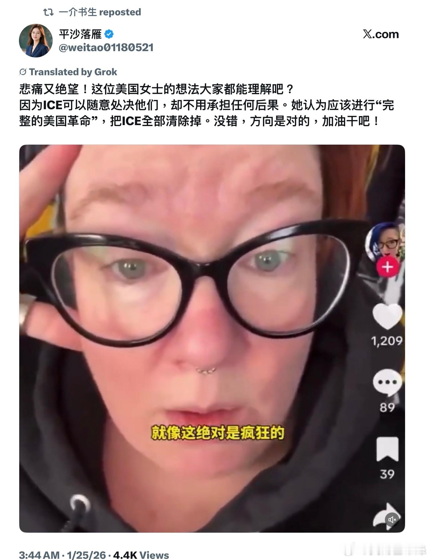 記得在2020總統大選前,明尼蘇達州發生了George Floyd被該州警察“過度執法”而導致死亡一案,結果全美到處出現Black Live Matter示威遊行,大喊defund police,在推波助瀾下進而演變成為大範圍暴動。昨天發生了ICE槍殺一名抗議份子事件,女白左大喊應該進行“完整的美國革命”,徹底廢除 ICE,在她們的眼裏,執法部門成了納粹,視法律與秩序為壓迫工具,進而將執法人員妖魔化。在中期選舉即將來臨之際,左派再次使出同樣的招數,試圖煽動全美暴動。這一次,他們會得呈嗎?選民們會辨別其中的真假是非黑白,而不被情緒左右嗎?2020年大選時,推特勒封鎖了對民左黨不利的訊息,導致民眾不明真相。幸好馬斯克收購了推特,如今民眾能夠獲得比較全面的訊息,並且通過訊息比對,自己判斷訊息的真假。民左黨喉舌豬流媒體也不再像之前那樣成為民眾獲得訊息的唯一渠道。