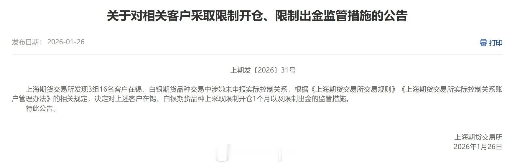 上海期货交易所发现3组16名客户在锡、白银期货品种交易中涉嫌未申报实际控制关系,根据《上海期货交易所交易规则》《上海期货交易所实际控制关系账户管理办法》的相关规定,决定对上述客户在锡、白银期货品种上采取限制开仓1个月以及限制出金的监管措施。