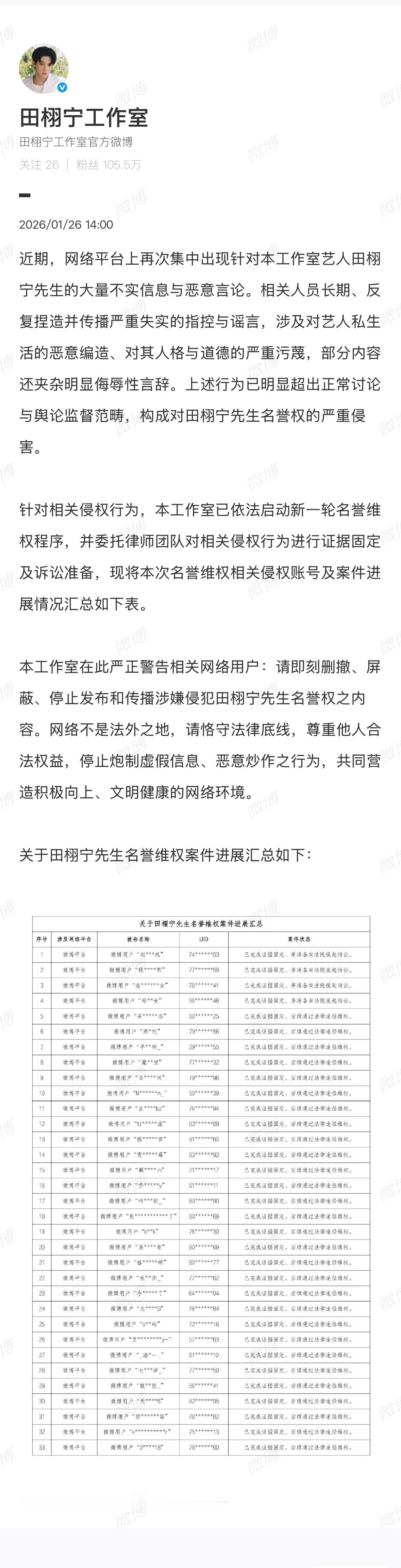 田栩宁工作室发告黑进展支持维权田栩宁工作室发告黑进展