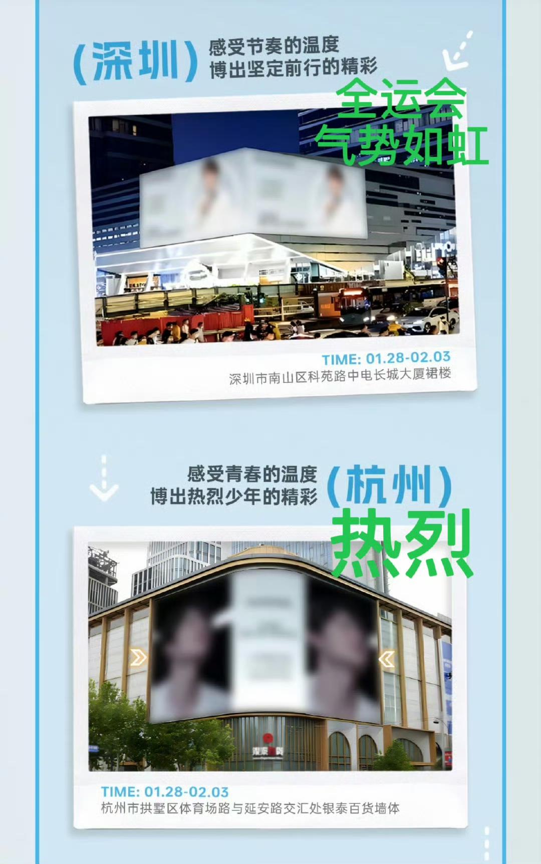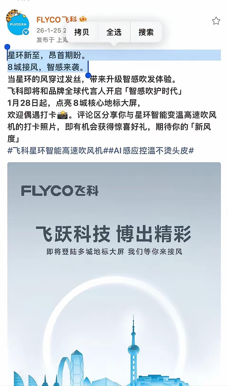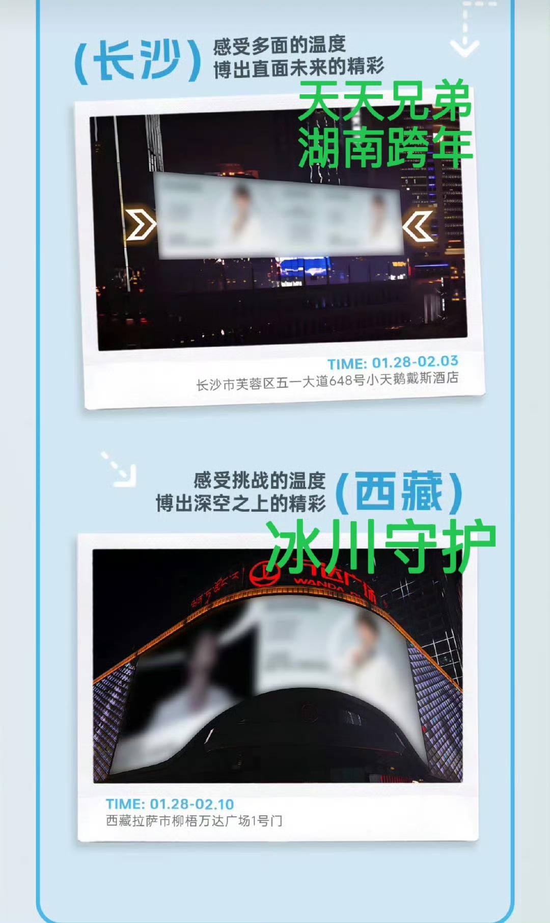 王一博新代言飞科预热,细心的网友发现即将点亮大屏的8个城市和宣传文案,都极其用心的与王一博成长和成就息息相关。 新品牌霸霸真的“好爱”[赞]。 北京:博出探索未知的精彩 (探索新境) 上海:博出不负速度的精彩(赛车) 河南:博出梦想起航的精彩(家乡) 厦门:博出突破自我的精彩(金鸡奖) 深圳:博出坚定前行的精彩(赛车) 杭州:博出热烈少年的精彩(陈烁) 长沙:博出直面未来的精彩(“长沙是培养我的地方” 西藏:博出深空之上的精彩 (守护冰川) 感动!王一博的真诚和优秀值得这样用心的真心以对!