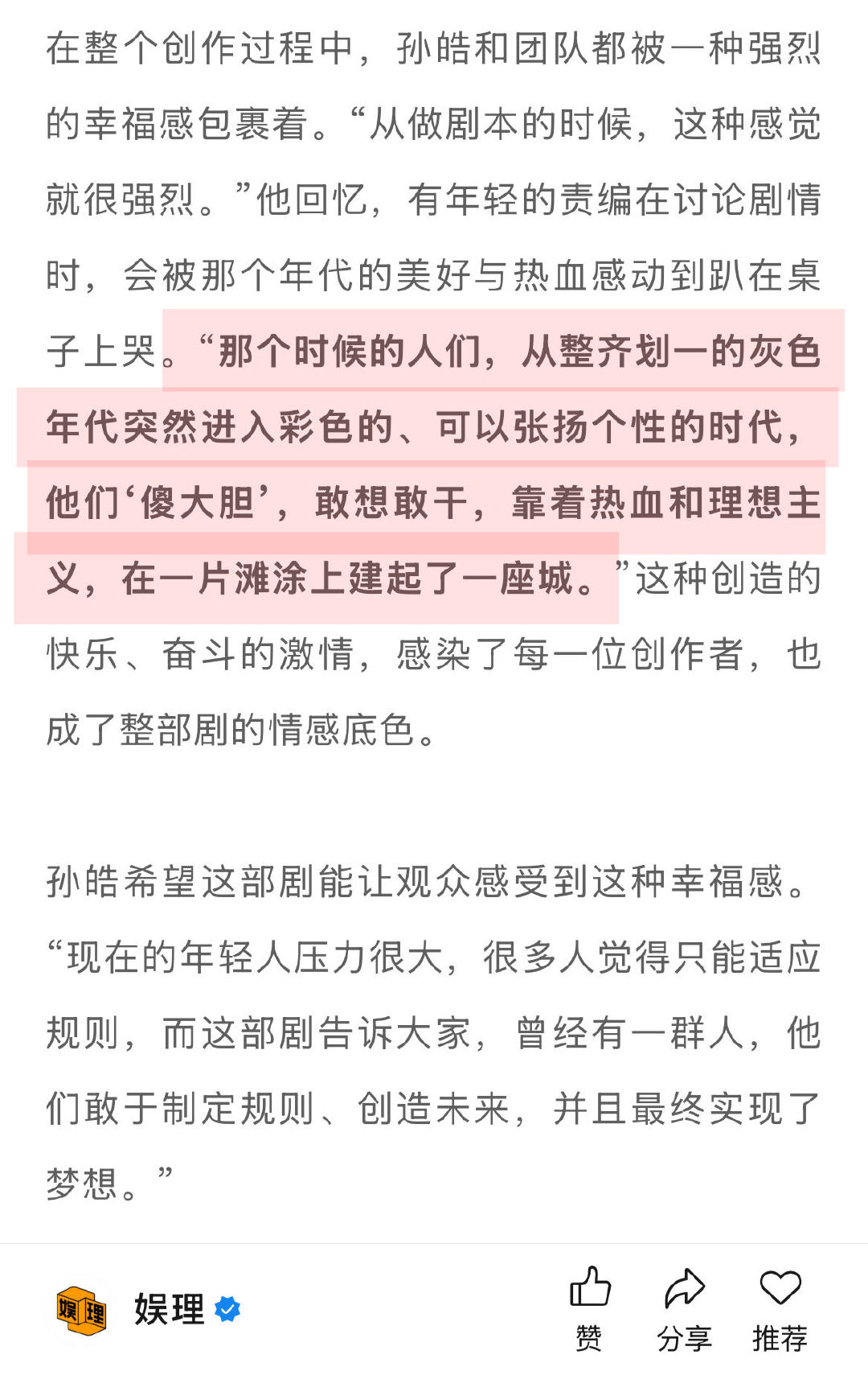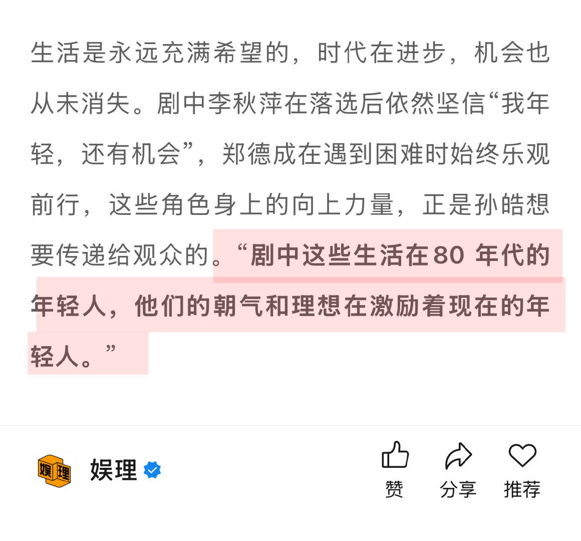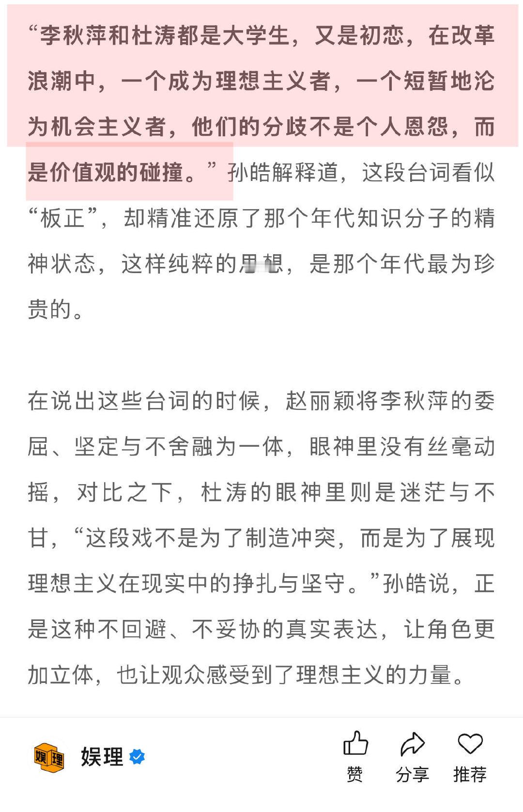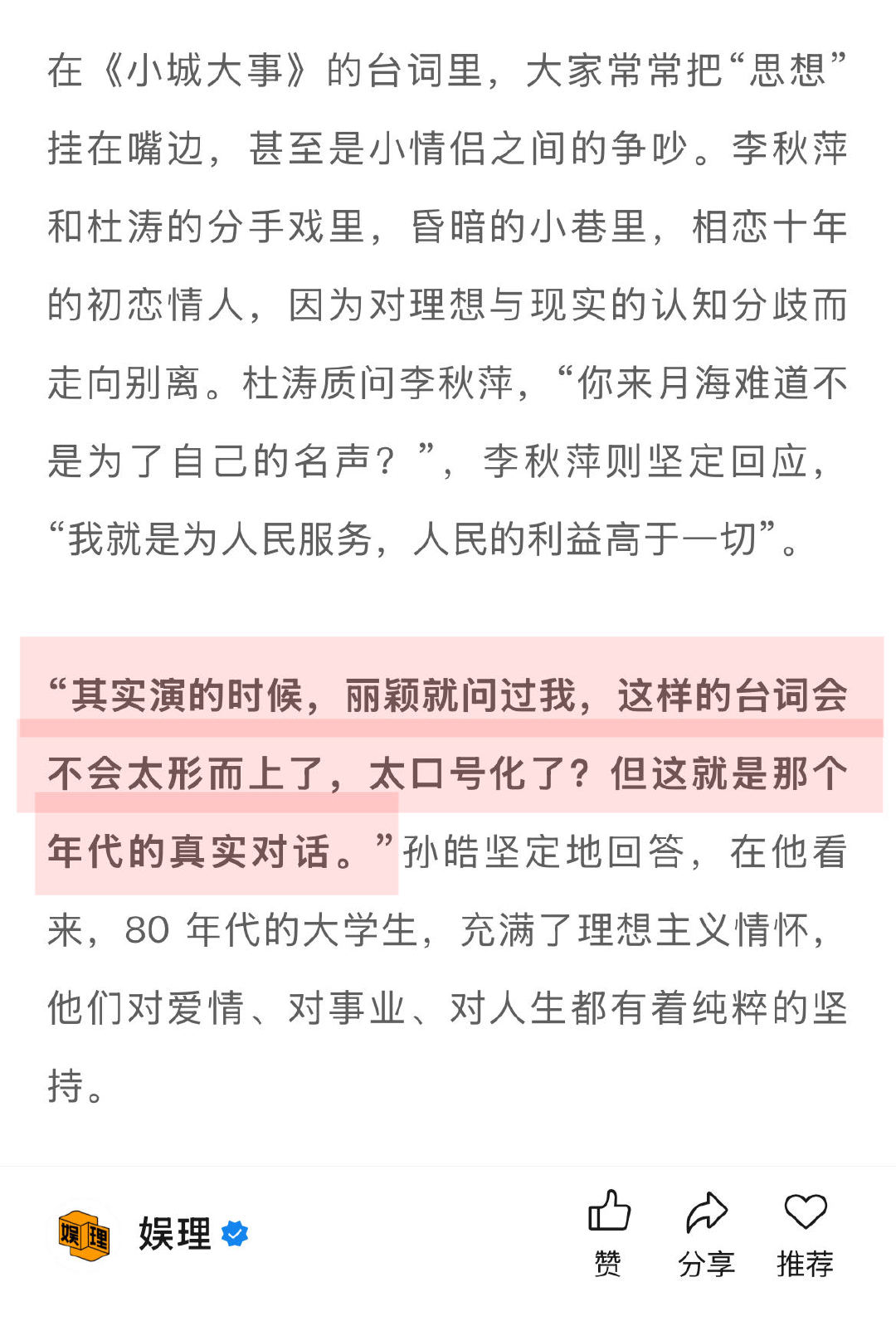 李秋萍的第一人选是赵丽颖 导演说赵丽颖不想待在舒适区 在《小城大事》的台词里,大家常常把“思想”挂在嘴边,甚至是小情侣之间的争吵。表示:“其实演的时候,赵丽颖就问过我,这样的台词会不会太形而上了,太口号化了?但这就是那个年代的真实对话。”在导演孙皓看来,80 年代的大学生,对爱情、对事业、对人生都有着纯粹的坚持。娱理独家↓