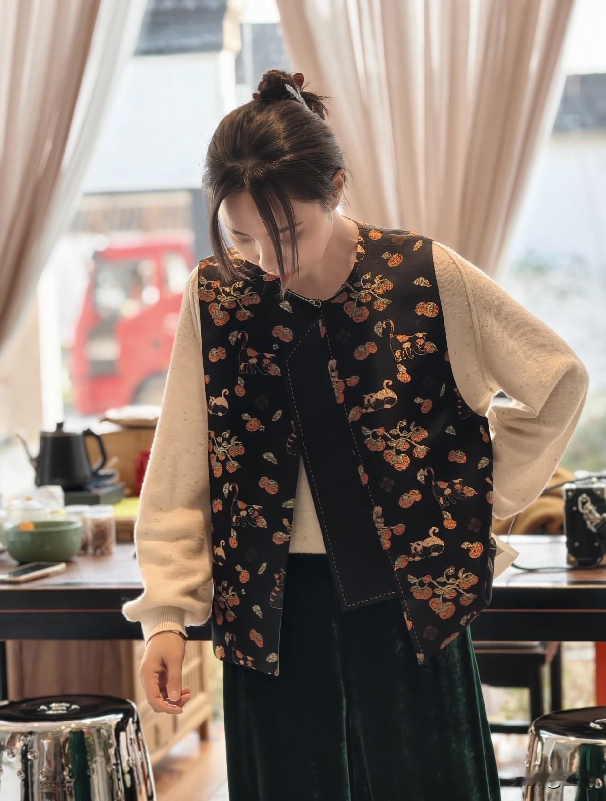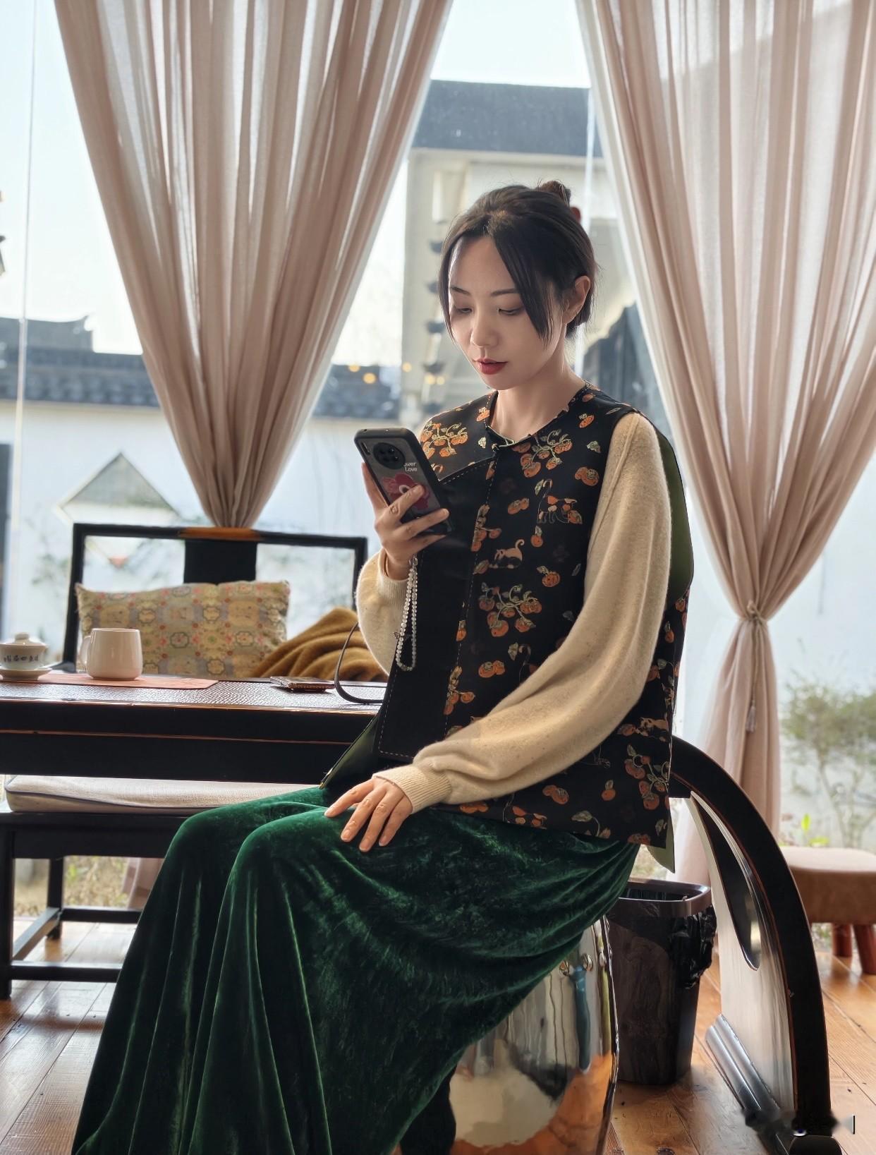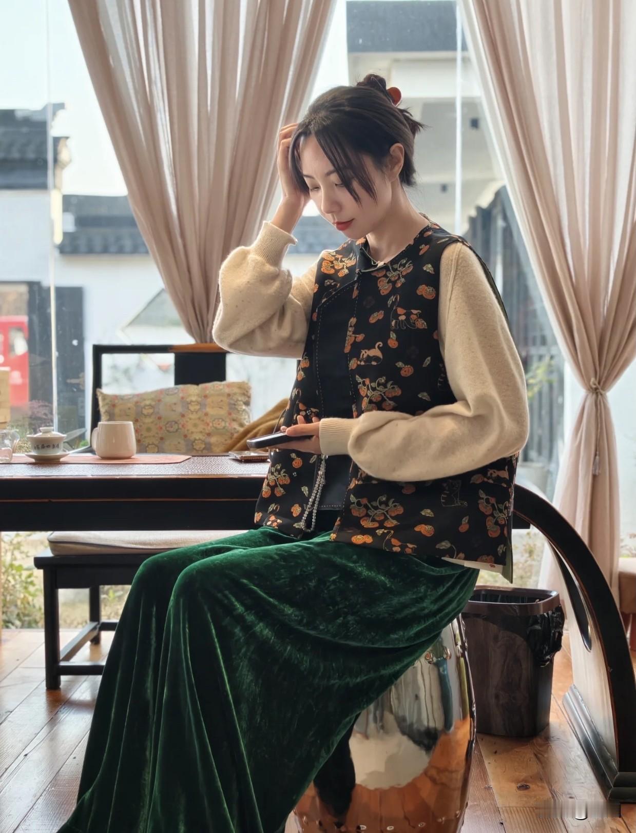 分享卓越的优雅女性秋日穿搭指南:复古印花马甲+绿色长裙,优雅气质满满!🍂👗💄
