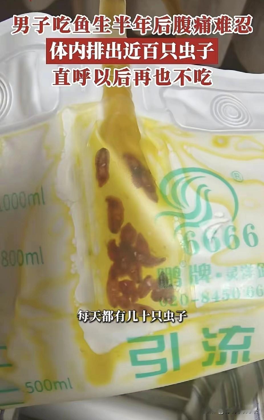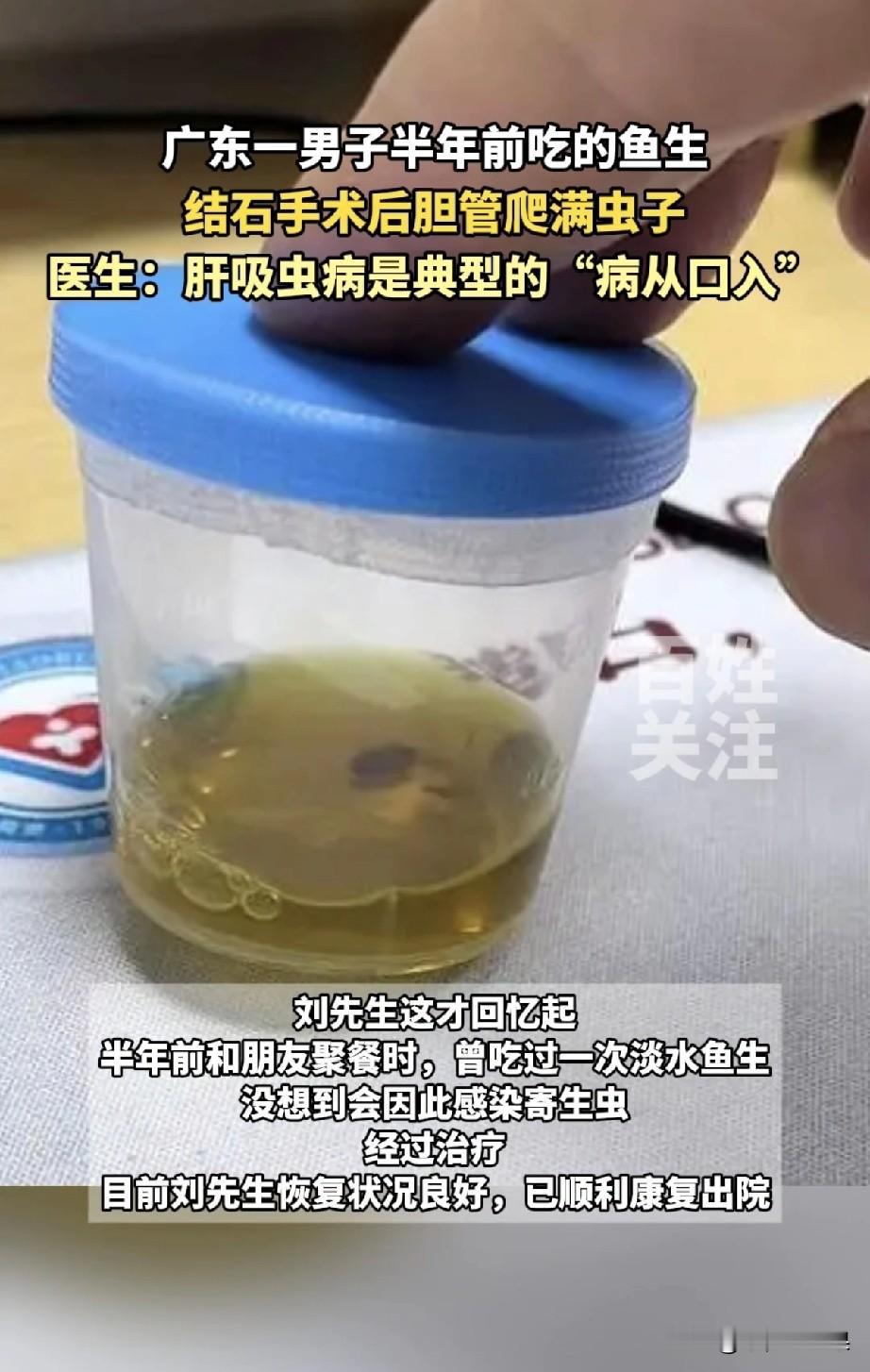 凌晨3点,广东急诊室冲进来一个捂着肚子打滚的男人。 “医生快救我!我疼得要晕过去了!” 他说自己半年前就吃过1次淡水鱼生,之后再也没碰过。 可等医生切开他的胆管,在场所有人都倒吸一口凉气—— 胆管壁上密密麻麻爬满了蠕动的肝吸虫,后续驱虫更是排出了近百条! 没人能想到,半年前的“一口鲜”,竟在他身体里悄悄建了个“虫窝”。 这些虫子在肝胆管里啃咬黏膜、堵塞胆汁,从无症状到引发结石、肝硬化,只需要几个月。 更可怕的是,肝吸虫能在人体存活数十年,等你发现时,可能已经拖成了胆管癌。 咱广东人是真爱吃鱼生啊,觉得鲜、够味,可你们知道不?就因为这一口瘾,广东都成肝吸虫重灾区了,每年好几万人中招! 别再信那些不靠谱的“土办法”了,全是坑! 以为喝高度酒、蘸芥末能杀虫?纯属自欺欺人!肝吸虫幼虫贼顽强,酒精、芥末根本奈何不了它,该感染还是感染。 觉得“就吃一次没事”?可别心存侥幸了!只要有活虫钻进你身体,就可能在里头扎根繁殖,等疼起来就晚了! ✅ 真正保命的做法超简单:淡水鱼、淡水虾必须彻底煮熟煮透,生的和熟的食材,刀具、砧板得分开用,别图一时嘴爽,把健康搭进去! 身边有爱炫鱼生的朋友,赶紧转发给他提个醒,别让他的胆管变成虫子的“安乐窝”!
