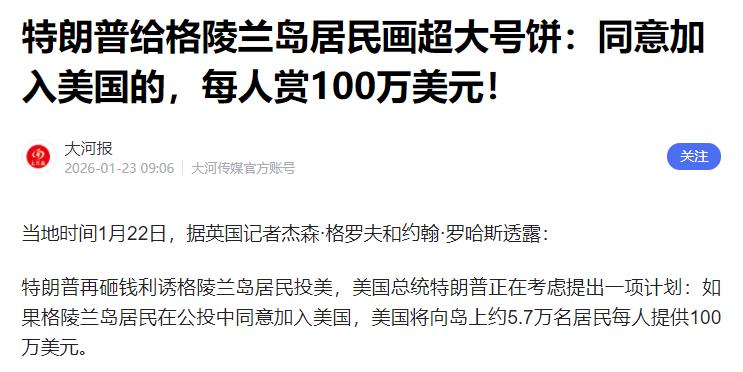 特朗普喊话格陵兰居民:一人十万美元不够,那就一人一百万美元! 之前他还想着拿每人 10 万美元收买格陵兰岛居民,让他们同意并入美国,结果被全岛 5.7 万人集体翻白眼,压根没人买账。 本以为他会就此收手,没想到转头就一拍大腿,把 “安家费” 直接翻了十倍,改成每人 100 万美元,这手笔看着吓人,实则还是没搞懂问题的关键。 按照《每日邮报》等外媒的报道,特朗普这次是认真的,就打算用这笔巨款 “收买民心”,只要格陵兰岛居民投票同意并入美国,这百万美元就立马兑现。 简单算一笔账就知道,光这一笔 “红包” 就得砸出去 570 亿美元,这还没算上后续要在岛上修军事基地、铺公路、建哨所的开销,这些钱加起来更是个天文数字。 可特朗普大概忘了,之前的民调早就显示,超九成的格陵兰岛居民都坚决反对加入美国,这可不是靠加钱就能轻易扭转的。 要知道,格陵兰岛不是超市里的商品,想买就能买,岛上的居民也不是缺钱就能随便出卖家园的。 格陵兰岛有着自己独特的历史和文化,当地 85% 都是原住民因纽特人,他们世代在这片土地上捕鱼狩猎,对家园有着极强的认同感和自豪感。 在他们眼里,家园是祖祖辈辈传承下来的根基,是无法用金钱衡量的,特朗普以为靠钱就能搞定一切,简直是异想天开。 之前 10 万美元被无视,现在加钱到 100 万美元,也不过是换汤不换药,根本打动不了当地人。 而且特朗普这算盘打得再精,也没考虑到现实中的诸多阻碍。首先格陵兰岛是丹麦的自治领地,就算要改变归属,也得先经过丹麦和格陵兰岛双方议会的同意。 这本身就是个复杂的过程。更重要的是,格陵兰岛的战略地位极其重要,它连接着北极航道和北大西洋航道,岛上还有稀土等丰富的矿产资源。 欧盟和北欧五国早就把格陵兰岛的主权当成了欧洲的共同底线,欧盟还计划把对格陵兰岛的支出翻倍,怎么可能眼睁睁看着美国把它抢走。 特朗普想靠钱就把这块战略要地收入囊中,不仅无视了格陵兰岛居民的意愿,更是没把丹麦和欧洲盟友放在眼里。 更可笑的是,特朗普这种 “花钱买领土” 的想法,早就过时了。美国历史上确实有过靠购买获得领土的案例。 比如用 1500 万美元买下路易斯安那,用 720 万美元买下阿拉斯加,但那都是特殊历史时期的产物,当时的卖方要么财政枯竭,要么国力衰落,才不得不出售领土。 现在的格陵兰岛可不是什么 “负资产”,随着全球气候变暖,它的战略价值和经济价值都在不断提升,当地居民早就看清了这一点,自然不会愿意被美国收购。 有当地居民就说过,美国政府只剩几年任期,但他们要考虑的是下一个千年,这种格局上的差距,不是靠钱就能弥补的。 特朗普一门心思靠 “钞能力” 推进买岛计划,说白了还是霸权思维在作祟,以为全世界的东西都能靠钱搞定。 可他偏偏没明白,领土主权和民族情感是金钱无法衡量的,格陵兰岛居民想要的是自己掌控家园的未来,而不是成为美国的一部分。 之前九成居民反对的民调已经说明了一切,就算把 “安家费” 再翻几倍,也改变不了这个事实。 到头来,特朗普这场耗资巨大的 “买岛闹剧”,大概率还是会以失败告终,毕竟他低估了格陵兰岛居民对家园的热爱,也高估了金钱在主权问题上的作用。 这种无视他国主权、仅凭一己私欲就想操控他国命运的做法,本身就违背了国际道义,自然不会得到任何支持。