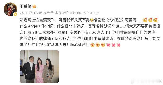 王岳伦 请大家不要再传播谣言王岳伦否认王诗龄休学 王岳伦发文:“最近网上谣言满天飞!听着我都哭笑不得😂编剧也没你们这么厉害呀……什么Angela 休学呀!什么缅北诈骗呀!等等各种胡说八道……请大家不要再传播谣言!散了吧…大家都不容易!”