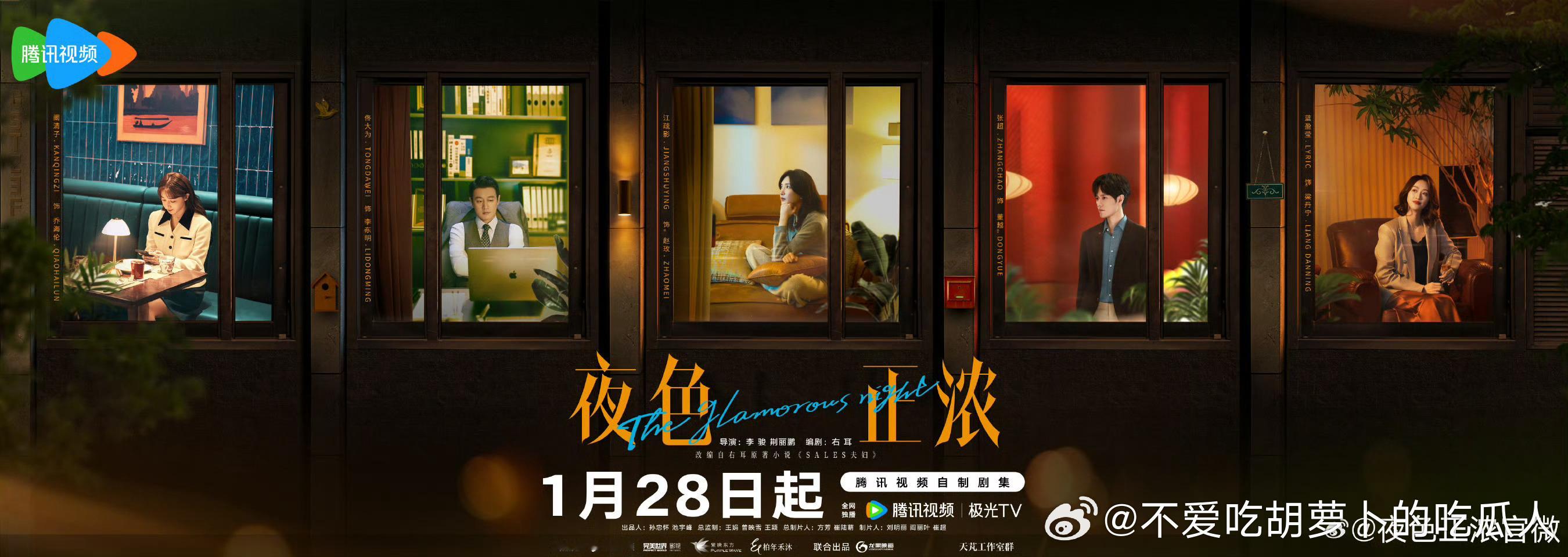 24集都市职场剧夜色正浓 定档1.28腾讯视频独播,1.29江苏卫视黄金档播出。导演:李骏、荆丽鹏领衔主演:江疏影、佟大为、张超、蓝盈莹主演:阚清子、袁文康、张兆辉、令卓、伍宇辰柠、王建新、刘恩尚、柯蓝、王耀庆、曾一萱。讲述了一群在洋酒行业相关工作的年轻人,赵玫、李东明、董越、梁丹宁等行业白领们,为了业绩与生活努力奋斗拼搏,一路上被人性与现实考验,最终从底层的促销员成为行业风云人物的成长故事。