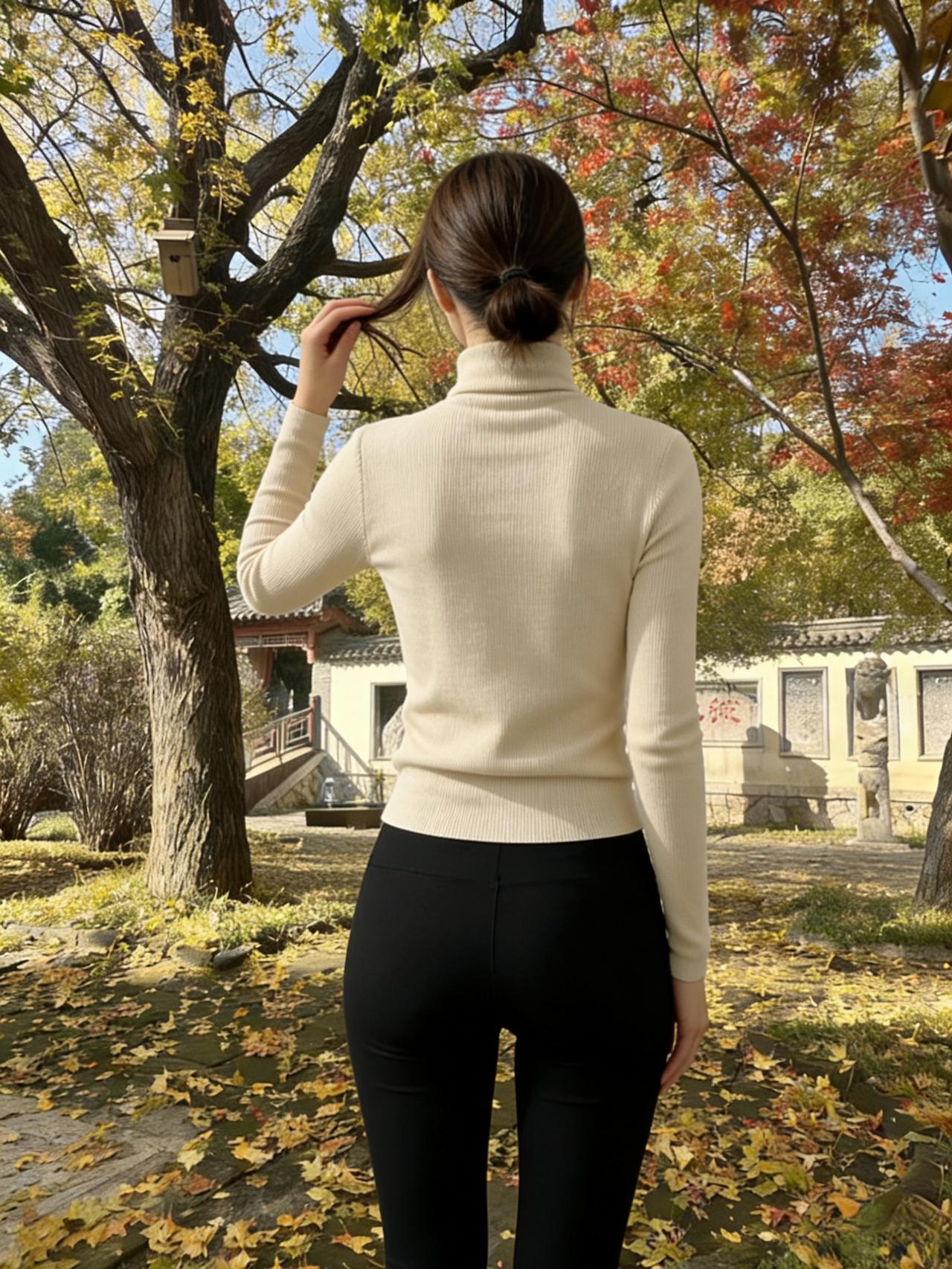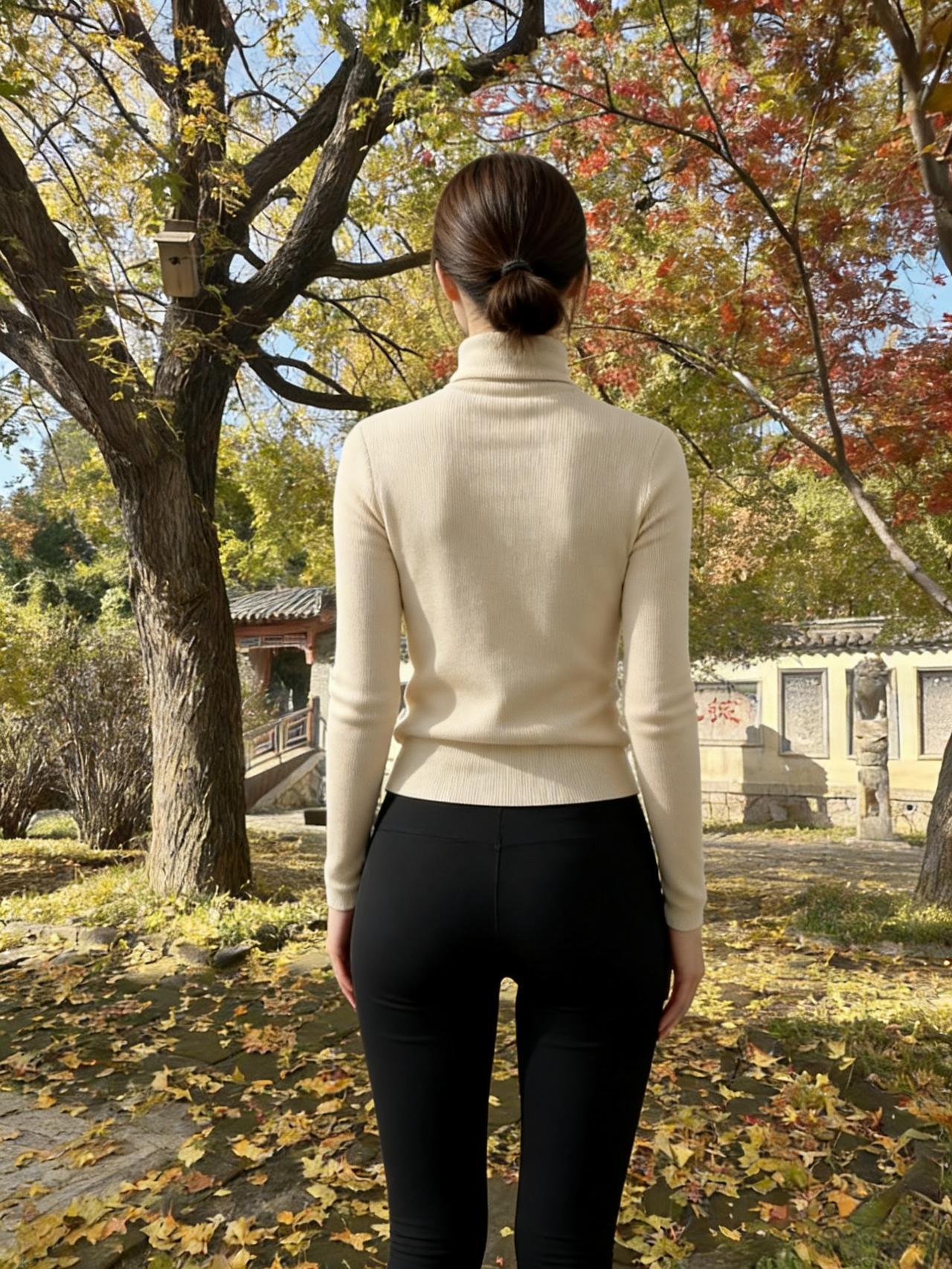 秋林凝晚照,衫色净、立娉婷。 看霜叶燃红,铺金银杏,塔影分明。 ~ 风轻,牵衣送