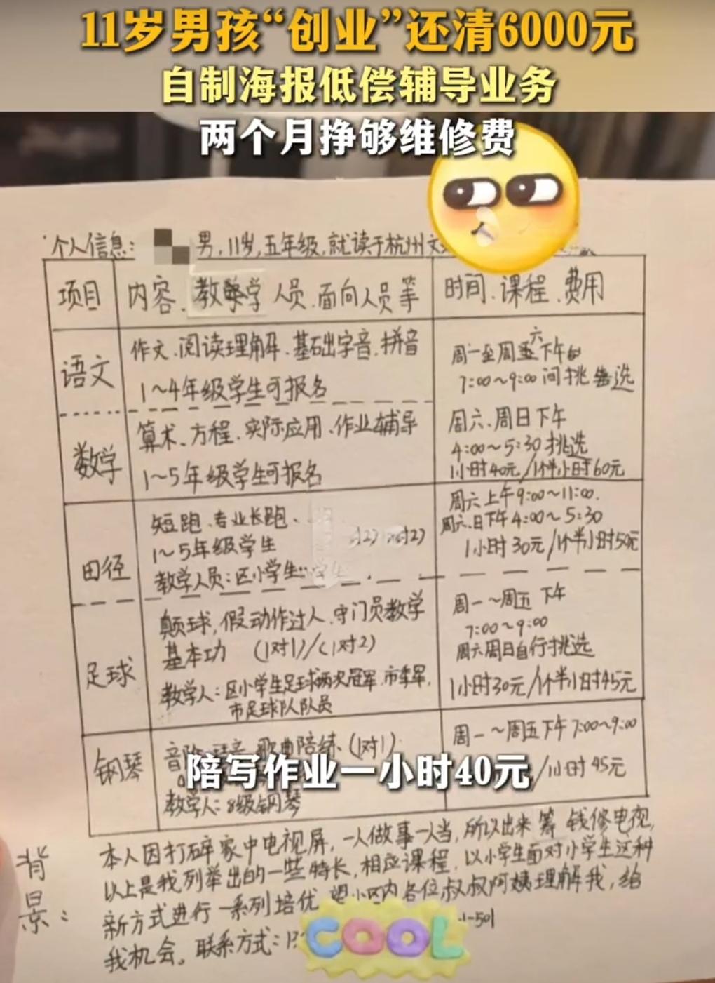 杭州一位11岁的男孩尧哥闯了祸——不小心划破了家里的大电视,维修费要六千块。 他没哭闹也没躲,而是主动提出“创业还债”:给小区里的孩子辅导作业、当运动陪练,一点点攒钱赔偿。妈妈程女士很淡定,说这是家里“体验式教育”的常态,赔钱不是目的,重点是让孩子学会承担责任。 这事儿在网上火了。有人竖起大拇指,夸孩子有担当,夸家长教得好:比一顿打骂强多了,现实的一课能记一辈子。 但也有人心里打鼓:让11岁的孩子打工还债,会不会太早把成人世界的压力转移到孩子身上?万一他因此觉得“犯错只能用钱解决”怎么办? 在我看来,程女士一家的做法,亮点在于“体验”二字——不是单纯惩罚,而是给孩子指了条路:闯了祸不用怕,可以靠自己努力弥补。 这比单纯赔钱或逃避,更能培养孩子的责任感和解决问题的能力。 但凡事有度。让孩子体验担当没错,却也要守住儿童成长的边界。比如,所谓“创业”是否在孩子的承受范围内?过程中,家长有没有及时关注他的情绪与压力? 责任教育不能变成变相的“结果主义”,否则孩子可能只记得“还债很累”,却品不到其中的成长意义。 家庭教育从来不是非黑即白的选择题。尧哥一家的尝试,更像是一次有温度的探索:在保护与放手之间,找到让孩子成长的恰当力道。 这不只是“怎么赔钱”的事,而是每个家庭都可能面临的“如何让孩子学会负责”的长期课题。 或许,比“该不该让孩子还债”更值得讨论的,是我们是否愿意给孩子试错的空间,又是否能陪他们在错误中长出自己的力量。 毕竟,最好的教育不是不摔跤,而是摔跤后,知道如何带着勇气和智慧,自己站起来。浙江男童