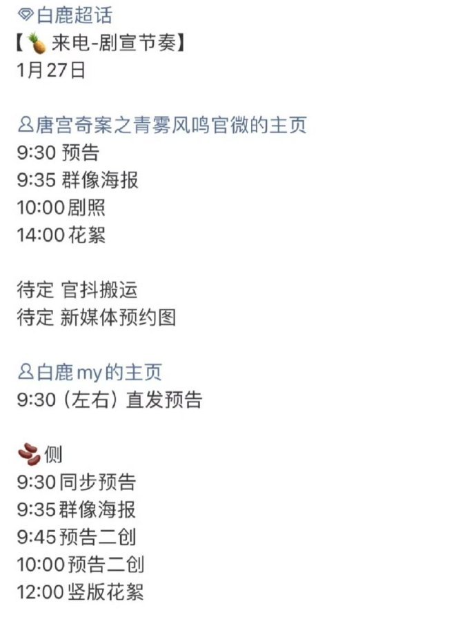 唐宫奇案物料发布节奏唐宫奇案开始宣发了唐宫奇案物料发布节奏,白鹿、王星越唐宫明日有物料发布,唐宫奇案开始宣发了,期待住早点和你们的故事见面啦~