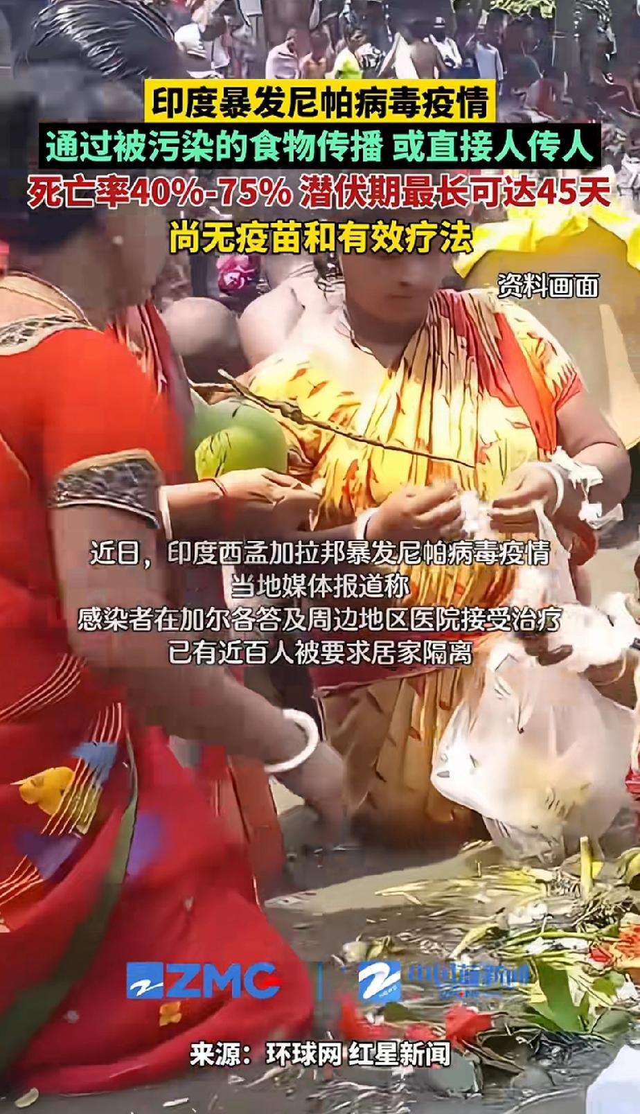 突然之间,我们的邻国印度东部的西孟加拉邦方,出现尼帕病毒感染病例。此病毒存在动物与人,人与人传播现象,已有5人被确诊,隔离了近百人。 世界卫生组介绍,该病毒能攻击人的肺部、大脑,症状表现为发烧、头疼、嗜睡、意识模糊、昏迷等,感染者的死亡率在40%以上。该病毒从感染到出现症状的潜伏期为4-14天,最长可达45天。最关键的是,该病毒目前没有疫苗和有效药。 听到又有疫情爆发,估计很多国人会想到2019年的疫情,随之接下来的三年抗疫,让我们国人至今仍心有余悸。暂停键一按,人员被隔离在家中,经济的停滞,人们生活的是胆战心惊! 希望我们一定把好国门,千万不能把病毒放进来。没想到2026年开年王炸,竟然是病毒。 尤其可怕的是,病毒是从印度开始传播,以印度的卫生条件,希望他能控制住病毒传播,那是不可能的。所以这个病毒一发生,周边国家都抓紧防控,避免祸入国门。 真想不到,时隔三年,传染病毒席卷重来,不知道人们将会迎来什么样的灾情?