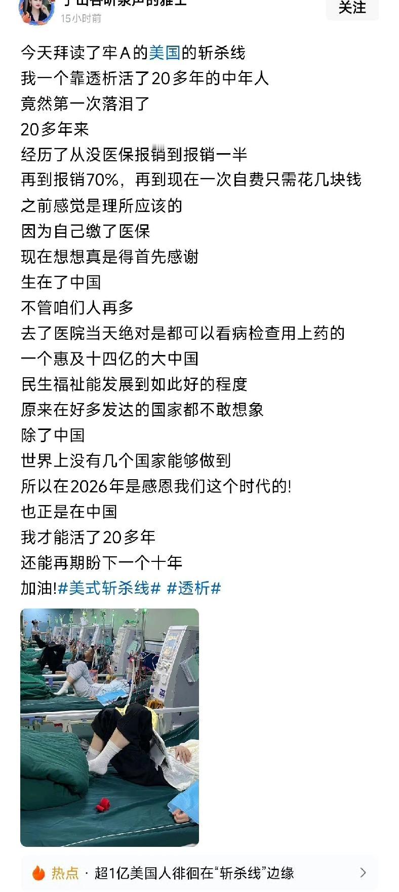 一个经历透析20年的中国人,说她拜读完牢a的斩杀线后,落泪了… 看到她的配图是一排躺着正在透析的病人时,也被深深的震撼了。 她说二十多年来自己经历了医保报销从无到有,从一半到70%,直到现在的一次只需自费几块钱。 以前她感觉因为她交了医保,所以享受这些变化她理所应该。 现在她看过牢a的视频后感觉根本就不是这么回事,老美才3亿多人,而我国足有14多亿人。 是我们的国家在竭尽全力争取兜底每一个公民。 她感慨如果自己身处美国,可能早就倒在了斩杀线上。而她在中国从生病算起已经活过了20多年。 所以26年她更有信心了,因为祖国越强盛,政策就更好。 她有信心去奔赴下一个十年的生命旅途,共同去见证祖国的未来。