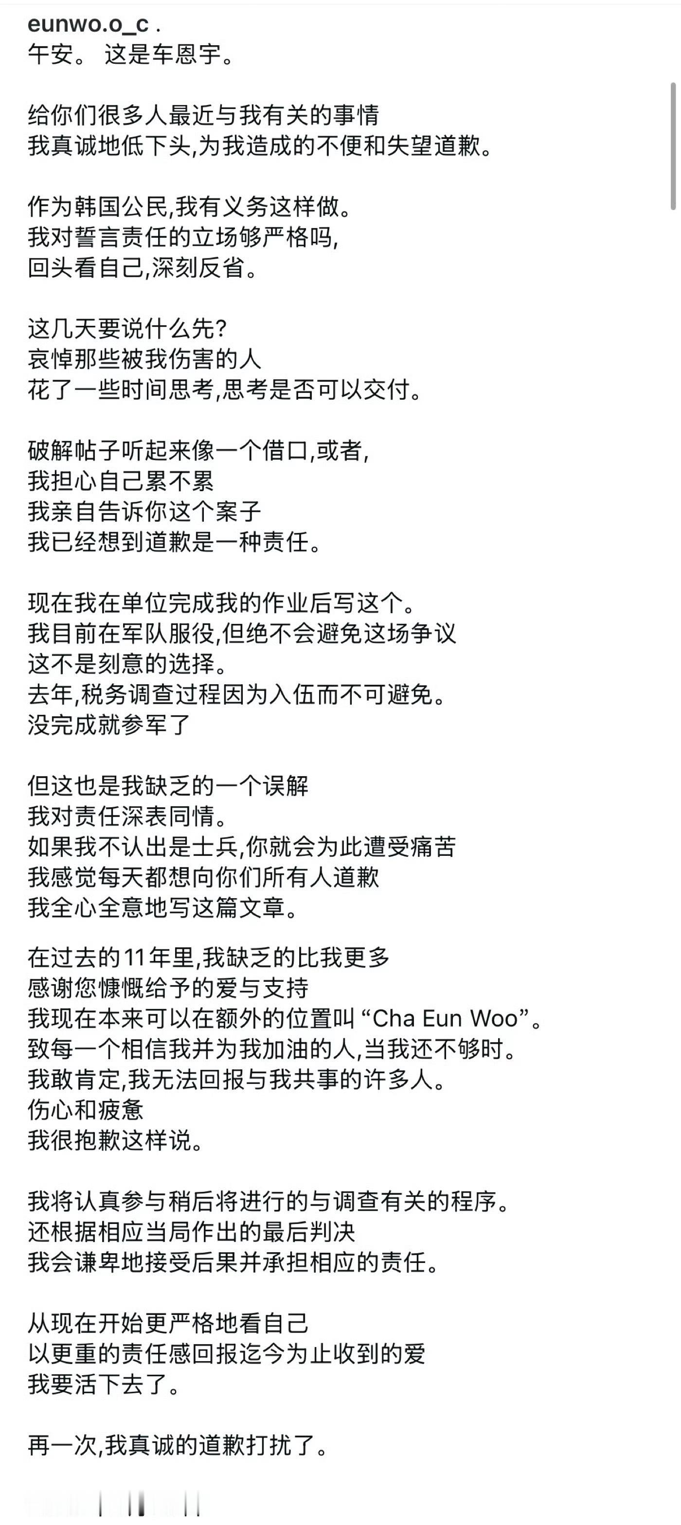 车银优发布长文,对涉嫌逃税200亿韩元公开致歉,承认“没有辩解的余地”,并承诺配合调查、承担责任。