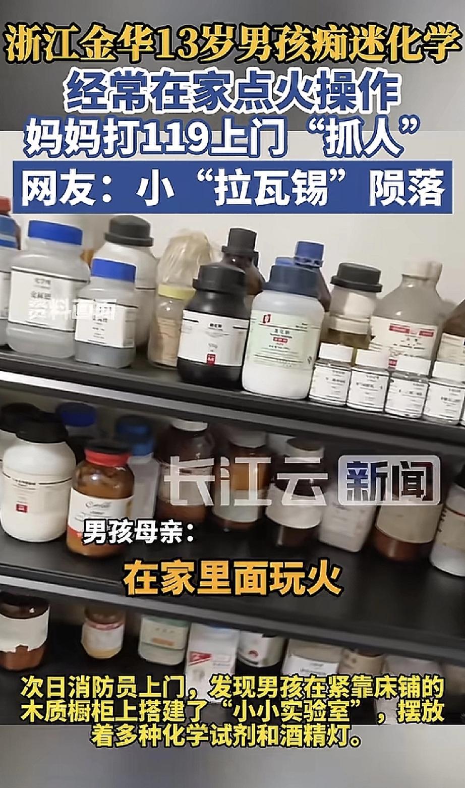 这孩子太“硬核”了!浙江金华一个13岁男孩,痴迷化学到了着魔的地步,经常在家自己捣鼓,点火做实验。 妈妈是又担心又后怕,家里堆着化学试剂,床边就是酒精灯,这万一着了火可怎么办?实在没招了,这位妈妈做出了一个“神操作”:直接拨打119,请消防员上门“抓人”! 消防员赶到后,对男孩进行了耐心的安全教育。网友们哭笑不得:这热情是好的,但安全第一啊!别让未来的“小科学家”,因为危险操作早早“陨落”。建议妈妈还是带他去正规的科技馆或实验室吧!