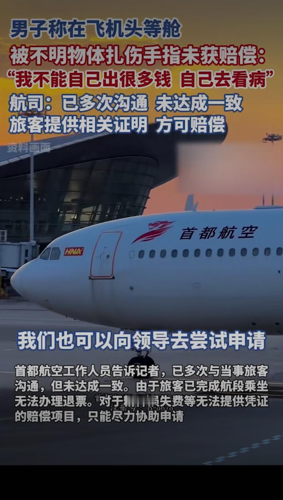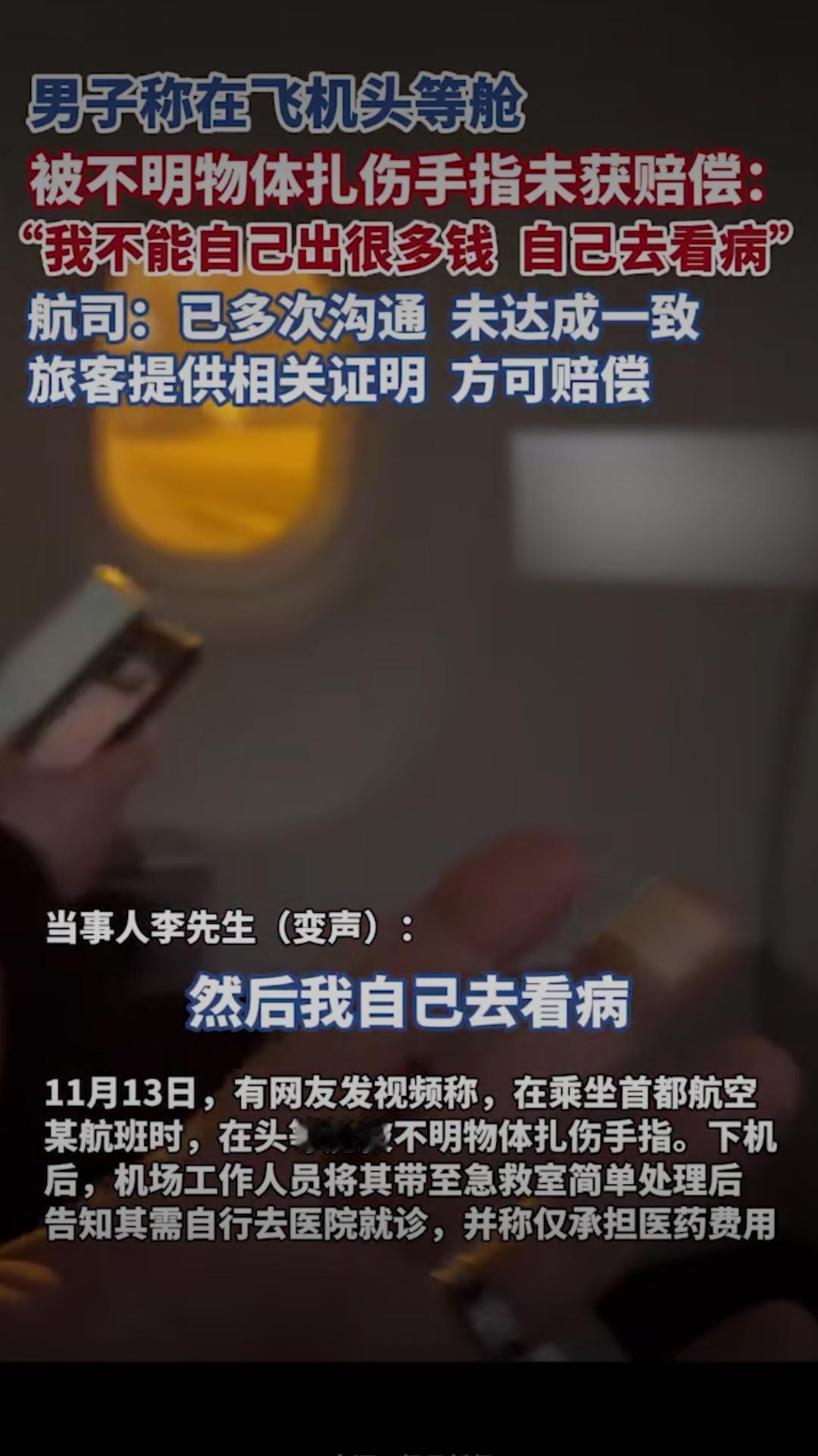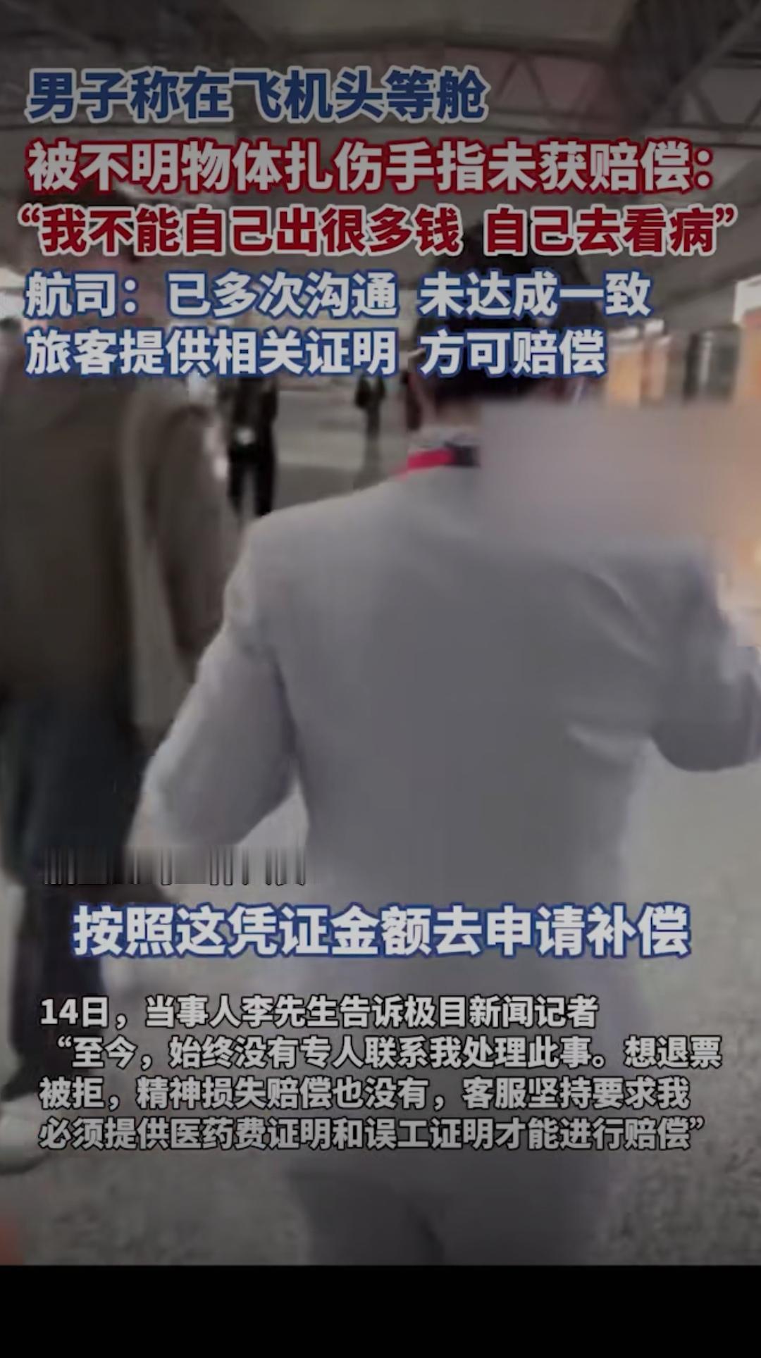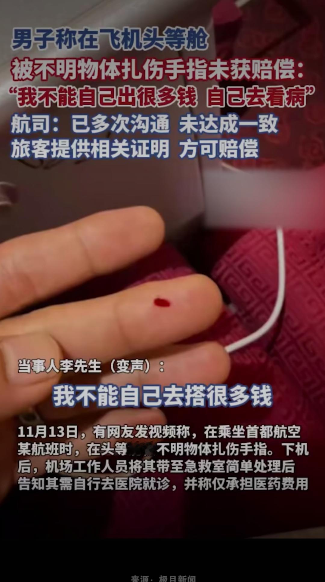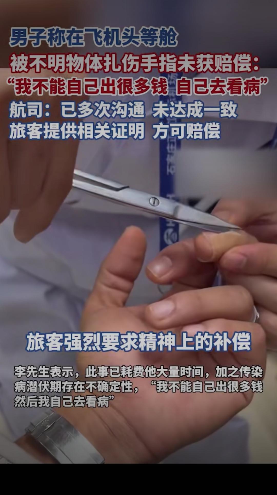 头等舱本是舒心的出行体验,却成了一趟糟心的维权路!男子搭乘飞机头等舱,竟被座位旁的不明物体扎伤手指,伤口刺痛难忍,可后续的赔偿事宜却让他寒了心,一句“我不能自己出很多钱自己去看病”,道尽了普通旅客维权的无奈与委屈,也让全网为他鸣不平:花钱买服务,反倒惹来一身伤,航司的处理态度,未免太让人失望!老百姓维权就是难 据男子描述,受伤后他第一时间向机组人员反映情况,现场也做了简单处理,本以为航司会主动跟进后续的医疗费用与赔偿,可没想到,后续沟通却屡屡碰壁。他辗转就医产生了不少花销,向航司提出赔偿诉求时,却被要求自行提供各类证明材料,哪怕提交了部分凭证,赔偿事宜也迟迟没有定论,多次沟通始终无法达成一致,航司工作人员仅表示“按凭证金额申请补偿”,轻飘飘的一句话,却把所有举证、奔波的成本都推给了受伤的旅客。 花高价坐头等舱,买的不仅是舒适的座位,更是航司的安全保障与优质服务。飞机客舱属于航司的管理范围,座位周边的设施安全本就该由航司全权负责,旅客在舱内意外受伤,航司本应主动承担责任,积极核实情况、协商赔偿,而非摆出“冷处理”的姿态,用繁琐的举证要求为难旅客。试想一下,旅客意外受伤后本就身心俱疲,还要花费时间精力搜集各类证明,反复与航司沟通,这样的处理方式,何来“服务”可言? 更让人气愤的是,航司口中的“多次沟通未达成一致”,本质上是责任推诿的借口。旅客的核心诉求很简单:为航司管理疏忽造成的受伤买单,可航司却始终站在被动应对的角度,不主动核实、不积极解决,反倒将举证责任无限放大,仿佛旅客的受伤是“无理取闹”。网友们看完纷纷怒斥:“自己的地盘出了安全问题,凭什么让旅客买单?”“头等舱的服务呢?出了事就甩锅,吃相太难看!” 航空出行的安全,从来都不只是飞行安全,客舱内的每一处细节,都关乎旅客的切身利益。航司的责任,也绝不该只停留在“把旅客送到目的地”,更要对旅客在舱内的人身安全负责。出了问题不可怕,可怕的是回避责任、冷处理维权的态度。一句“按凭证申请”,寒的不仅是这位受伤旅客的心,更是所有搭乘该航司旅客的信任。 旅客不是维权路上的孤军,合理的诉求本就该被正视。希望涉事航司能放下推诿的姿态,主动核实情况,承担起应有的责任,给受伤旅客一个合理的交代,也给所有旅客一个安心的出行保障。你怎么看待航司的这一处理方式?遇到过类似的出行维权难题吗?快来评论区说说你的看法!
