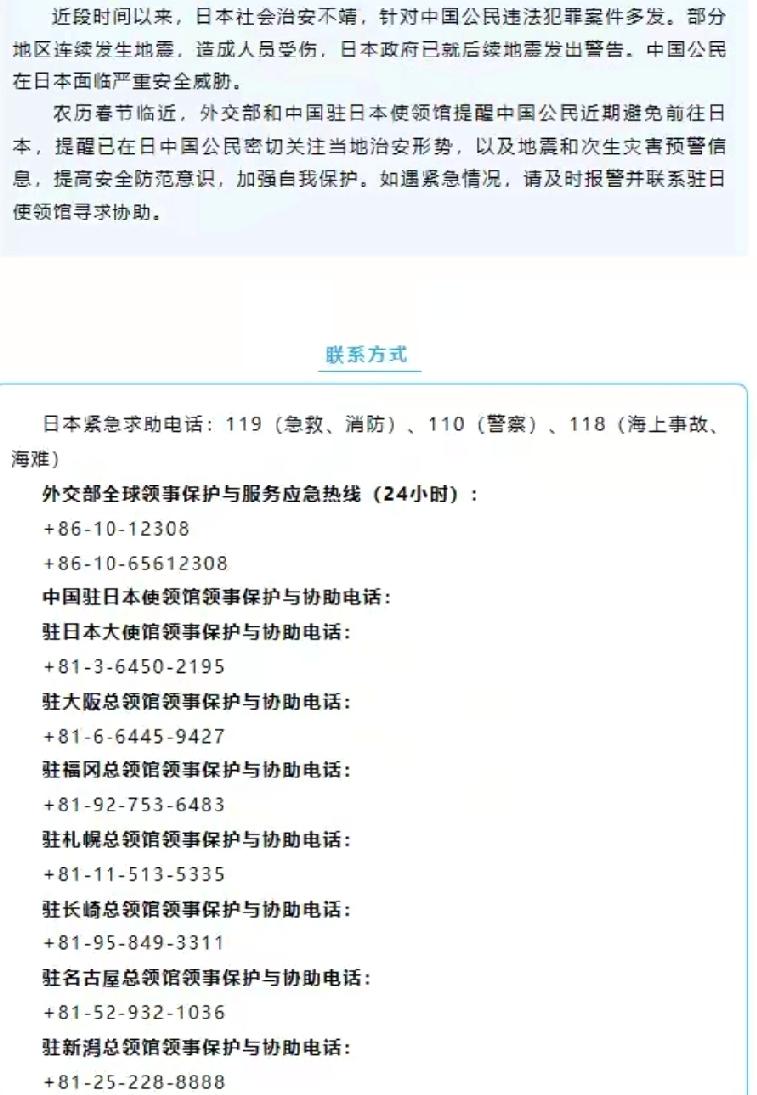 外交部紧急提醒春节别去日本!吵翻的背后,藏着最真实的人性与牵挂 腊八刚过,春节的脚步越来越近,不少人早就订好了赴日的机票酒店,满心期待着一场异国团圆之旅,可外交部的一则紧急提醒,直接让所有计划被按下了暂停键:春节期间,避免前往日本!这则提醒一出,评论区瞬间炸锅,有人怒怼执迷不悟的人,有人委屈哭诉退订要亏几万,有人纠结到底换不换目的地,看似各执一词的争论,说到底,都是对春节这份团圆的珍视,只是有人把安全放在了首位,有人被沉没成本绊住了脚步。 谁都能理解那份对远方的期待,提前大半年做攻略、订早鸟票,带着爸妈去看北海道的雪,陪孩子去逛大阪的环球影城,这份满心欢喜的筹备,换谁都舍不得轻易放弃。可外交部的提醒从不是空穴来风,而是基于最真实的风险数据:日本近期治安持续不靖,针对中国公民的辱骂、殴打事件频发,新宿的汽车撞人案至今让人揪心,多名同胞无辜受伤;环太平洋地震带的活跃让日本多地余震不断,福岛附近的地震预警从未停止,救援延迟、语言不通的困境,真要遇上了,就是叫天不应的无助。 那些觉得“只是提醒不是禁止,小心点就没事”的人,其实是被社交媒体的“日本滤镜”蒙蔽了双眼。我们刷到的永远是商家挂着的中文招牌、贴心的服务,却看不到驻外使领馆每天接到的求助电话,看不到同胞在异国遭遇不公时的无奈。官方看到的是真实的风险,而我们看到的是包装后的美好,这份信息差,赌的却是一家人的平安。春节本是团圆的日子,图的就是一个安心,何必拿着家人的安全,去赌一个不确定的结果? 当然,也心疼那些退订要亏几万的朋友,辛苦攒的钱打了水漂,任谁都心疼。但好在国航、东航等航司早已开通了免费退改通道,即便第三方平台有损失,比起平安,这点钱又算得了什么?更何况,东南亚的暖风、国内的大好河山,哪一个不能承载春节的团圆?曼谷的中文标识、普吉岛的贴心服务,东北的冰雪、云南的暖阳,一样能过个热热闹闹的新年。 外交部的这则提醒,从来不是“拦着大家出去玩”,而是身为祖国对每一位同胞的牵挂。无论走多远,身后总有国家的守护,这份兜底的安全感,才是最珍贵的年味。春节的意义,从来不是去哪个网红目的地打卡,而是一家人平平安安聚在一起,吃一顿热乎的年夜饭。 平安,才是春节最该有的底色。你是选择果断退订保平安,还是仍在纠结不舍?评论区说说你的想法,愿每一个家庭,都能过一个平安团圆的新年!