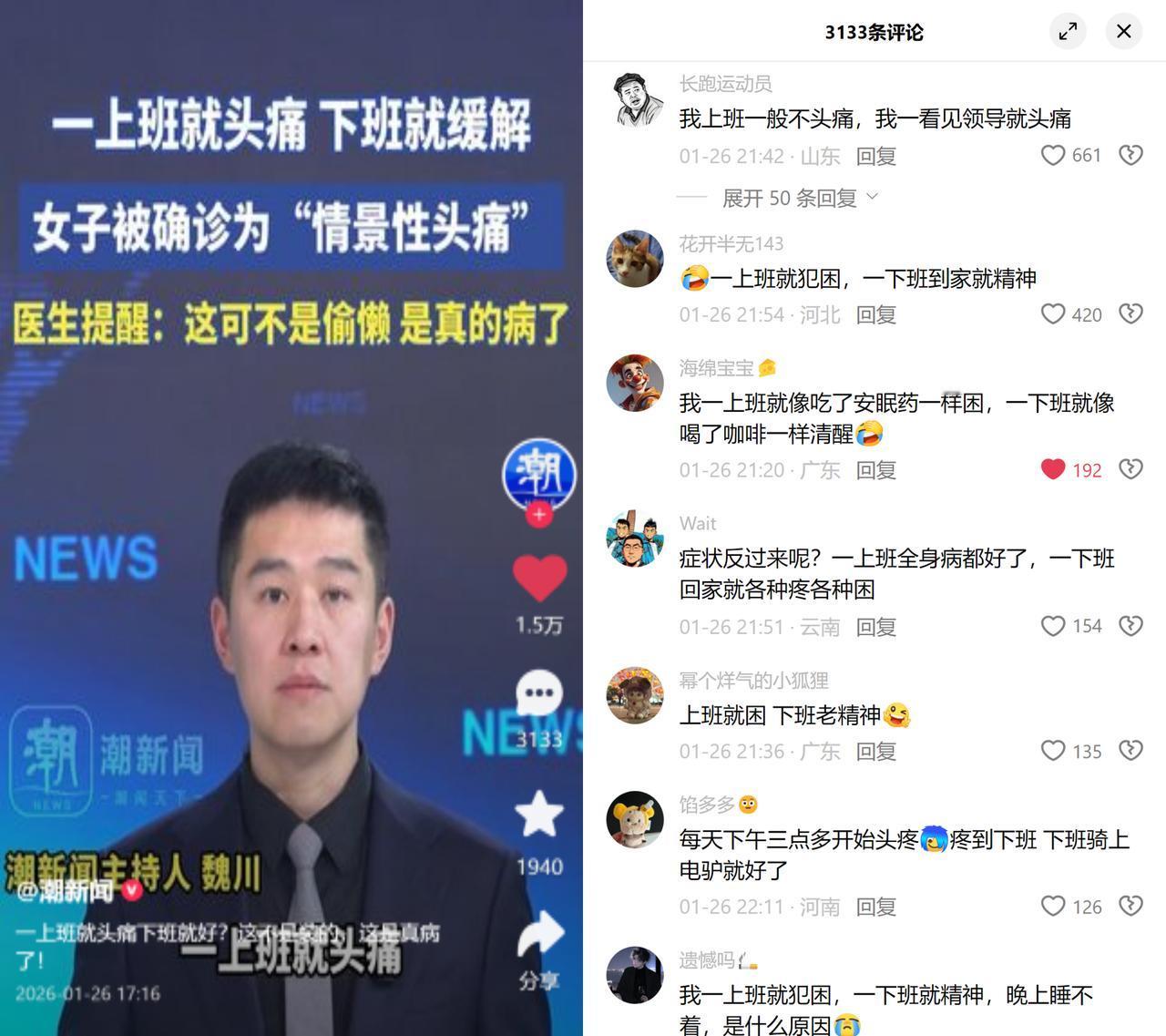 一上班就头痛下班就好?这真不是装的! 南京张女士确诊情景性头痛,一进办公室就脑壳疼,下班秒活,引发了全网打工人的精准共鸣。 看看大家的同款症状:有人看见领导就触发头痛,有人下午三点准时疼到下班,骑上电驴风一吹立马痊愈。听着像是戏谑调侃,背后却是被工作情境反复消耗的生理性呐喊。 去年8月刚落地的新版职业病目录,把职业性创伤后应激障碍纳入了,但这种日常上班熬出来的情景性头痛,还没挤进法定清单。真要认定工伤,得硬扛着举证头痛和工作直接相关,难度堪比登天。 打工人的上班病,真的不叫矫情。什么时候这种隐性消耗,能被真正看见呢?