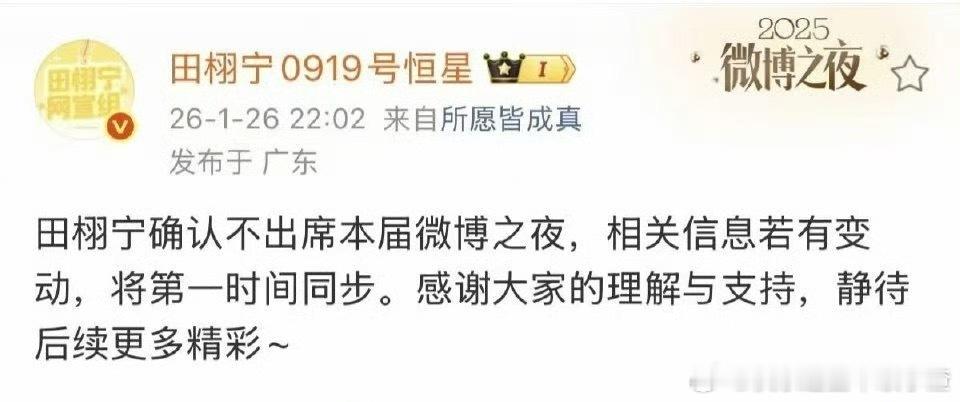 田栩宁对接发文表示不出席本届微博之夜