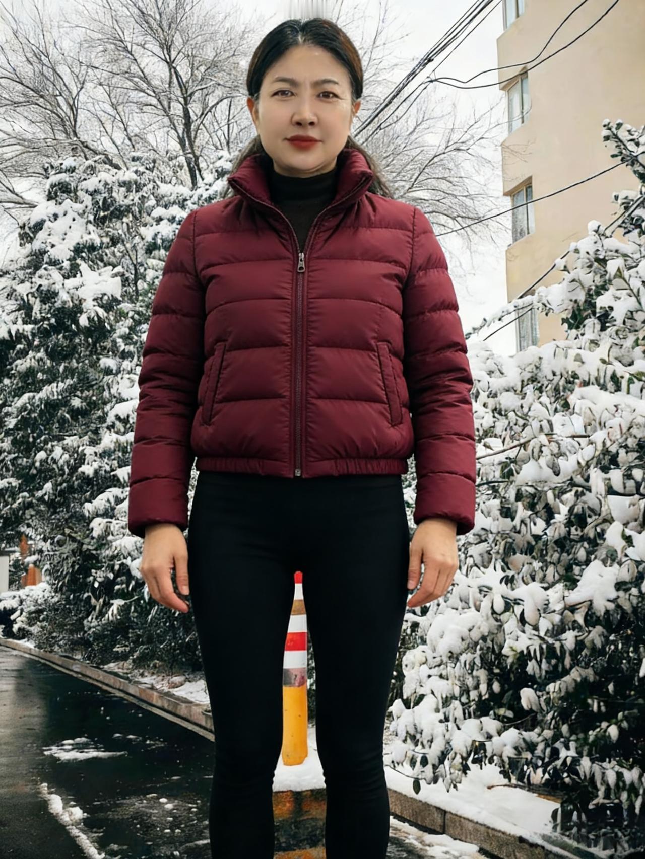 翠袖凝寒立晓风,霜痕微缀鬓边松。 笑开冻雪三分白,衣染晴光一抹红。 携素手,踏霜